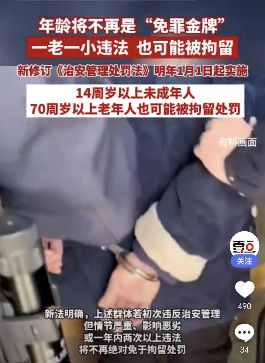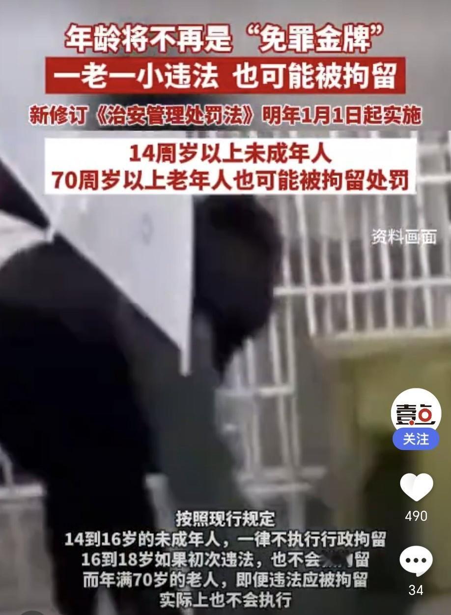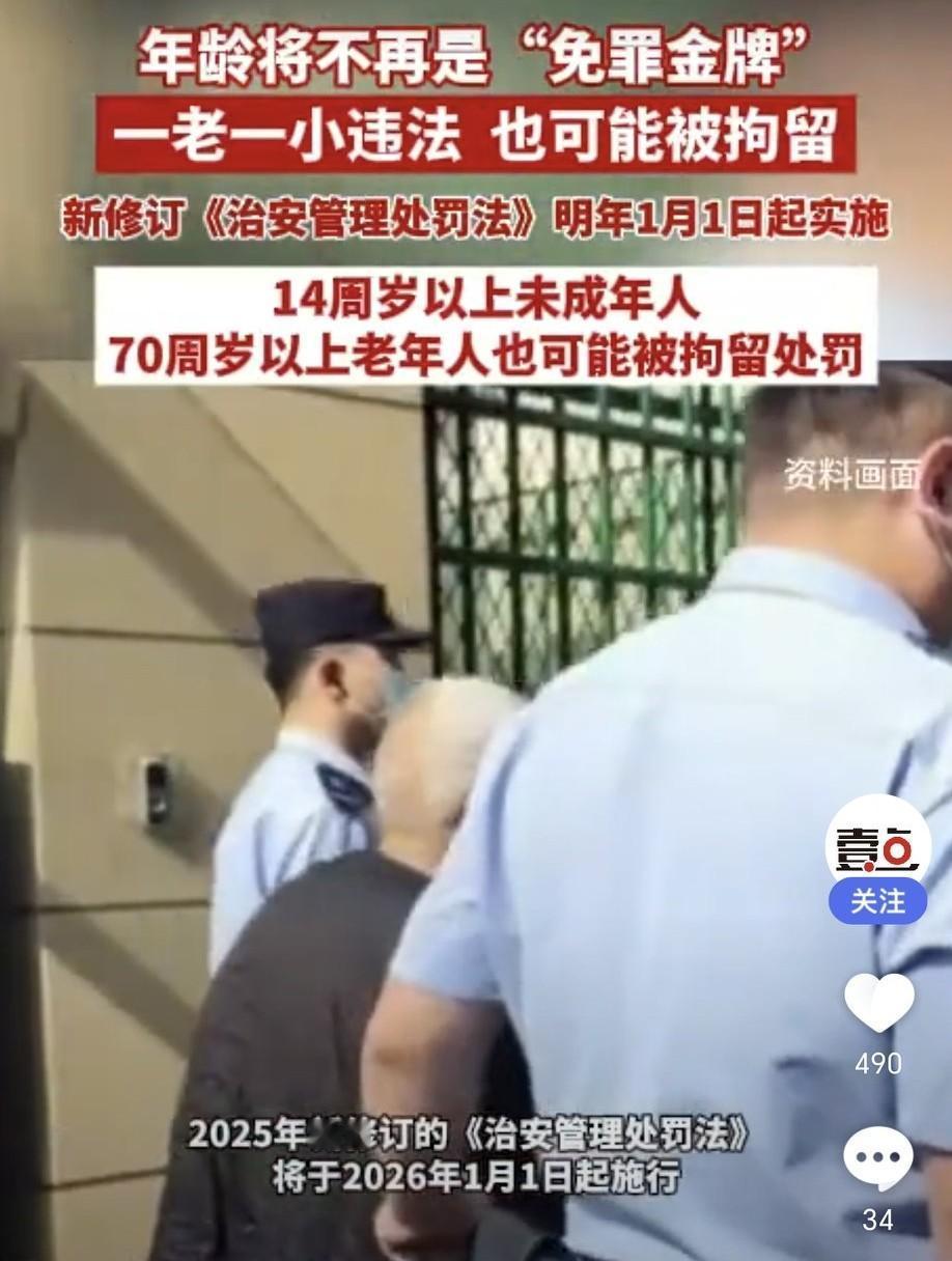 2026年1月1日起,新修订的《治安管理处罚法》要施行啦!年龄不再是“免罪金牌”。以前,14至16周岁未成年人、70周岁以上老年人等群体应拘留可不执行,结果有人就把这当成“免责金牌”屡次违法。 现在新法规定,要是“情节严重、影响恶劣”,或一年内二次以上违反治安管理,就不再豁免。像未成年人一次殴打多人造成恶劣伤势,老年人一年内两次违规(如种罂粟、打人),都会被拘留。 A网友:14还是大了,12差不多,这个时候正是叛逆期,不好管、容易走错路的时候。 B网友:应该提前到12岁,而且是和成年人同等待遇。学校教育不能让其改变,社会教育必须让其改变。 C网友:个人觉得,犯罪比如小偷这种,可以有年龄限制,涉及人身伤害的犯罪无论年龄大小都应该判刑。 D网友:犯罪了就该承担,无论是犯罪分子还是监护人都应该承担自己该承担的责任,而不是留给社会或者留给无辜的人承担! 之前黑龙江、陕西等地有因年龄未被执行拘留的案例,新法实施后,这种情况会得到有效约束,真正体现“过罚相当”。