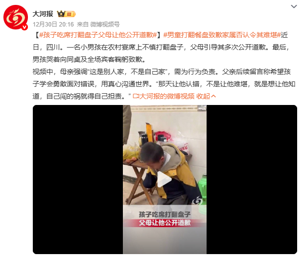 孩子吃席打翻盘子父母让他公开道歉“这不是别人家,是社会课堂。”父母让孩子公开道歉的初衷获部分网友理解:公共场合的规则意识需从小培养,否则“熊孩子”背后多是纵容的家长。但也有声音提醒:别让道歉变成二次伤害,孩子低头认错时,家长更该蹲下来抱抱他。