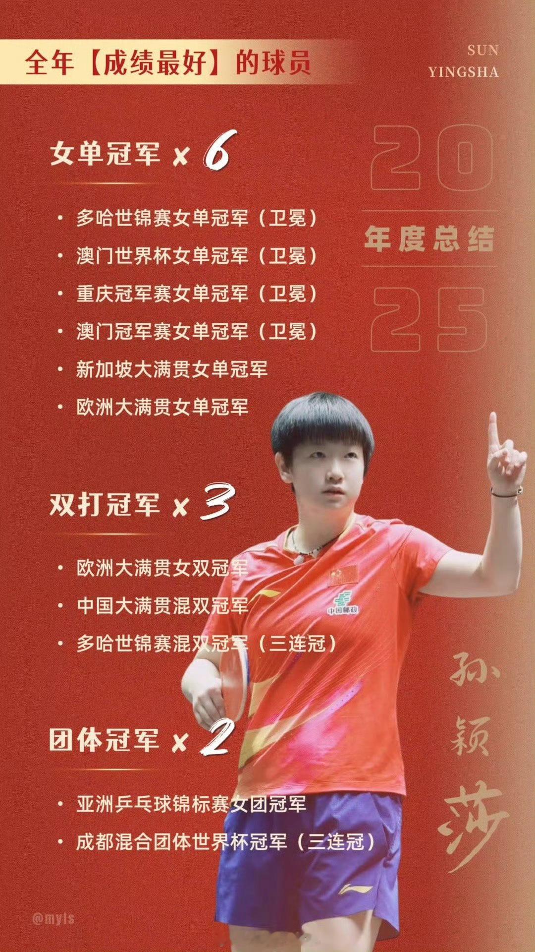 WTT发布孙颖莎2025年度总结2025年孙颖莎本人双卫冕三大赛世界杯世锦赛女单冠军🏆完成女乒历史首位双圈金满贯🏆对外协胜率100%,2025三大赛胜率100% 年终世界排名第一,年终积分11600。单打六冠🏆🏆🏆🏆🏆🏆 外战无失;稳如磐石,锐不可当。孙颖莎2026年要健康涨球,继续闪耀吧!