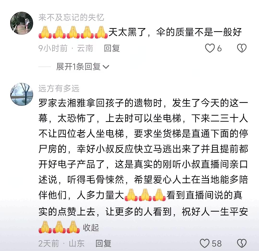 二十多人对四个老人。 手里拿着防爆盾,攥着棍子,甚至有人全副武装穿戴整齐。这场面,你要说是去抓捕什么悍匪,我都信。可对面站着的,仅仅是罗帅宇的父母和亲戚,一共四位头发花白的长辈。他们去湘雅医院,不为别的,只是想拿回属于逝去孩子的遗物。 这一幕出现在罗帅宇叔叔的直播间里,听得人后背发凉。 晚上十点多,医院大厅的灯光惨白惨白的,照得人心慌。你想想那个画面,一群穿制服的人把路堵得严严实实,甚至不需要动手,光是那股压迫感就足够让人窒息。给出的理由特别荒诞:“公共电梯检修”。 哪有这么巧的事?偏偏家属来了,客梯就坏了? 更让人细思极恐的是,他们指的那条路——货梯。有知情的网友在评论区瞬间炸了锅,那条货运通道的尽头,直通遗体存放区。 这哪里是让人走的路?这分明是想把活人的嘴给堵上,把事情往阴暗的角落里拽。如果当时那一帮老实巴交的长辈真的乖乖进了那个铁盒子,门一关,信号一断,后面会发生什么?不敢想。 罗叔叔是个明白人,也是个硬骨头。 他没吵没闹,只是默默掏出了手机,把摄像头举过了头顶。这是弱者手里唯一的武器了。 屏幕里,那一排排制服瞬间有些骚动。有人下意识地想躲镜头,有人还在机械地重复“规定”。叔叔把直播画面往群里一甩,在线人数蹭蹭往上涨,舆论的热度一上来,现场那种剑拔弩张的气氛才稍微松动了一点。 这时候,所谓的“为了安全”才变成了“靠墙等等”。 等了十来分钟,所谓的负责人终于露面了。提着一个透明袋子,轻飘飘的。 家属千盼万盼,结果袋子里只有一副裂了镜片的眼镜,还有一张简短得可怜的清单。 手机呢?身份证呢?那些最关键的、能藏着孩子生前轨迹和秘密的随身物品呢?一句“尚在核对”,就把所有疑问挡了回来。 眼镜碎了,就像这支离破碎的真相。 那一刻,叔叔没敢再纠缠。他心里清楚,那部不知通向何处的货梯绝不能上。四个人,硬是绕到了楼梯间,那是唯一的生路。楼梯转角的监控探头,红光一闪一闪,像一只只窥探的眼睛。 甚至走到出口,阴影里还有拎着对讲机的人影晃动,看见手机镜头扫过来,立马别过头去。 这哪里是医院?这分明是谍战片里才有的情节。 那一晚,四个老人根本不敢回原来的住处。他们在离医院三站地的地方,随便找了个不起眼的小旅馆挤了一夜。 半夜里,陌生的电话一个接一个地打进来。不说话,或者试探性地问“拿到东西了吗”。叔叔没接,直接把手机扣在桌面上。这时候接电话,谁知道对面是人是鬼? 最让人毛骨悚然的是那个细节:晚上回到暂住地,门外的楼道里突然响起了脚步声。不急不缓,就在门口停住了。停了几秒钟,没有敲门,也没有说话,脚步声又慢慢远去。 这是警告?还是确认? 一个刚刚失去儿子的母亲,这几天只能靠给亲友发定位、发那几个干巴巴的字报平安。而那个一直在前面顶着的叔叔,语气绷得像一张拉满的弓。 现在他们手里只有那副破眼镜。 那些本该属于罗帅宇的私人物品,到底在谁手里?为什么这么怕家属拿回去?如果只是一起普通的事件,为什么要动用防爆盾?为什么要逼走货梯? 这些问题,医院到现在没有一个字的正面解释。 所谓的“院感管理”,在二十多根棍子面前,显得那么苍白无力。这早已不是简单的物品交接,这是一场不对等的博弈。一方手里握着解释权、监控权和暴力机器,另一方手里,只有一部快没电的手机和满屏网友的愤怒。 叔叔在直播说,他不想带节奏,只想把东西清清楚楚拿回来,哪怕只是一件衣服,也要有个说法。 他关了灯,黑暗里只有手机充电口的指示灯亮着。视频备份好了,电充满了,天亮之后,还得继续去问,继续去磨。 门外的脚步声也许还会响,但只要那摄像头还亮着,有些东西就藏不住。