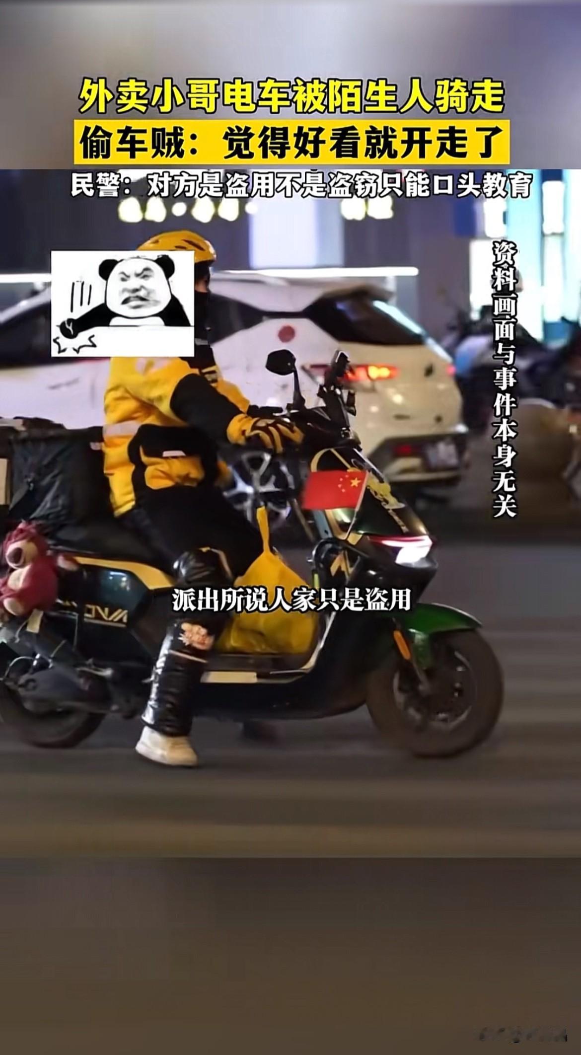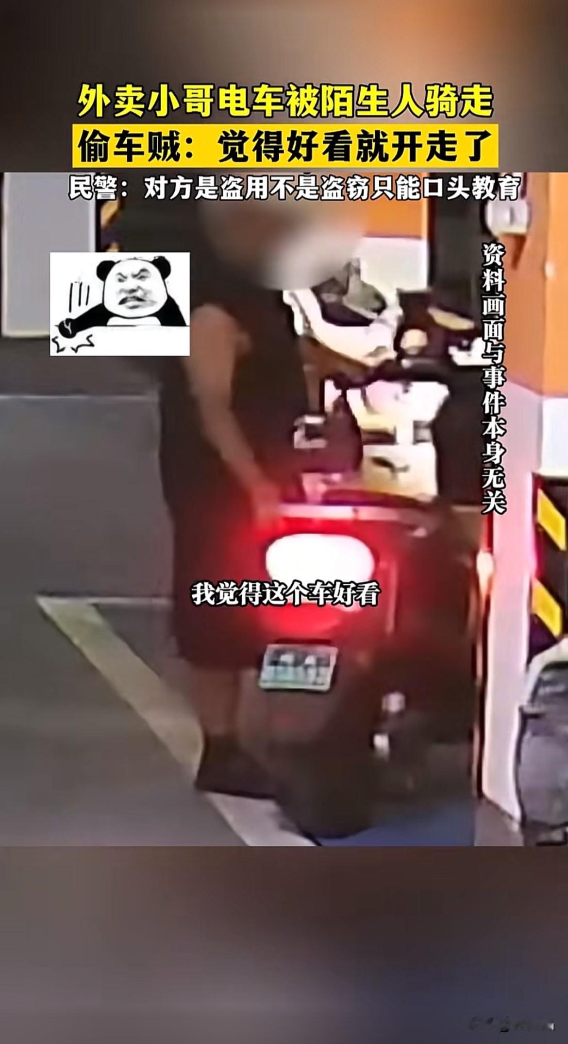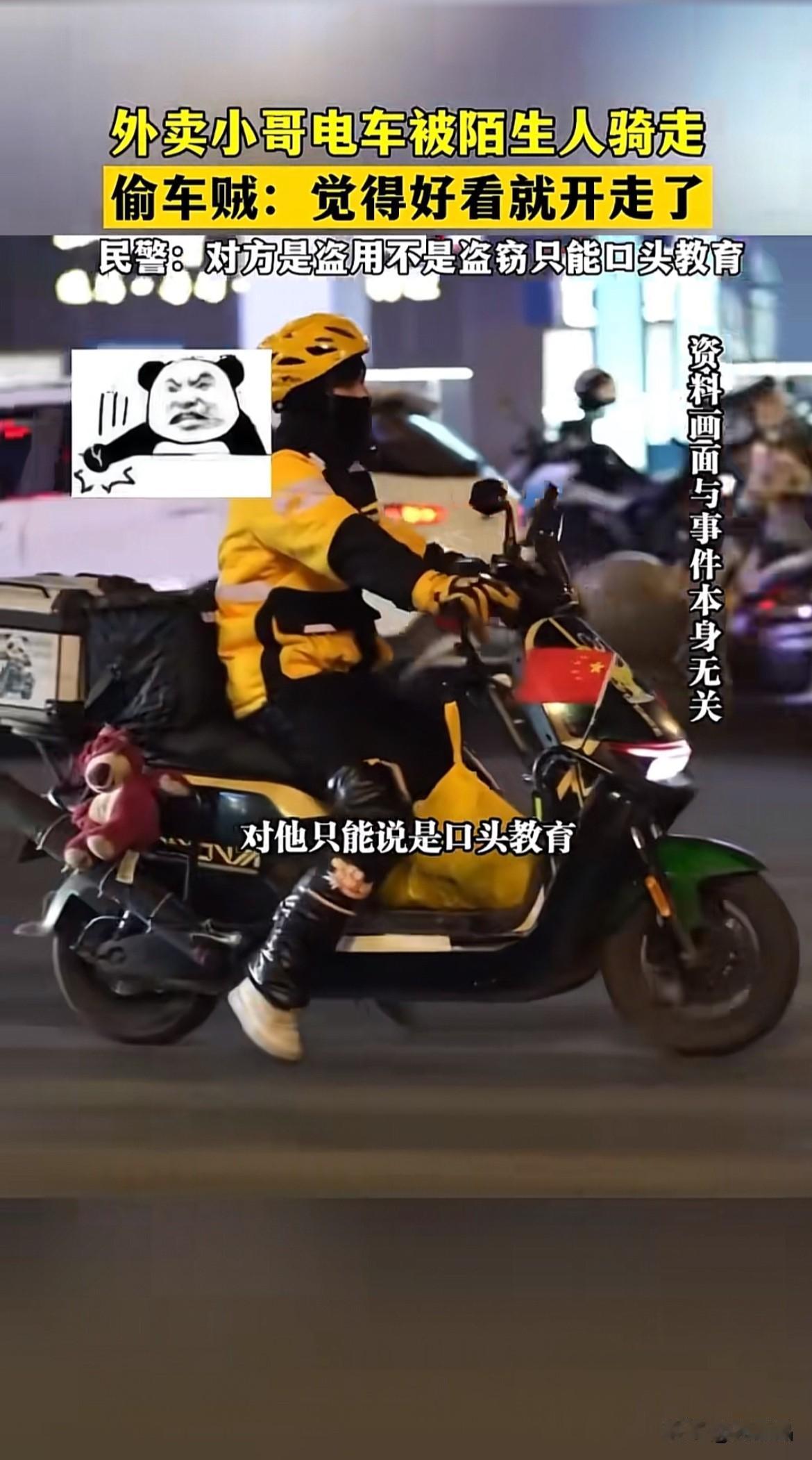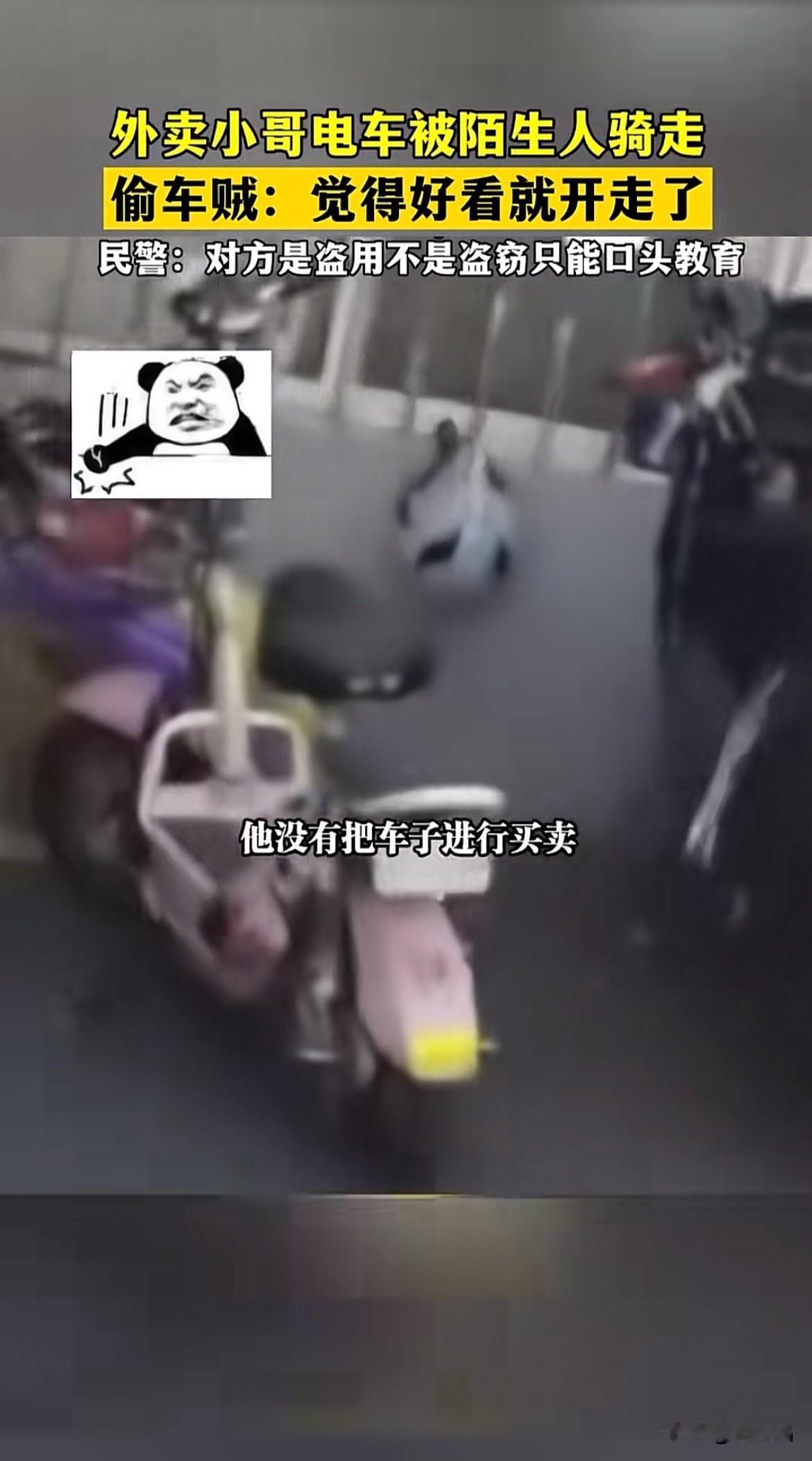 万万没想到!江苏无锡,一外卖小哥电动车被陌生人偷走,报警后偷车贼说觉得车好看就骑走了,更让人没想到的是,偷车贼只被口头教育一下就完事了。 外卖小哥如往常一样,骑电动车送餐时,随手停在楼下,钥匙没拔,就赶忙去送餐,没想到送完餐回来,发现车不见了,于是报了警。 民警通过调查,很快找到了外卖小哥的电动车和抓到了偷车贼。 偷车贼对其偷车行为供认不讳,声称:我觉得车好看就骑走了。” 外卖小哥要求偷车贼赔偿误工费,偷车贼拒绝赔偿,对此,民警给出的处理是只能口头教育,因为没有充足证据证明偷车贼偷车后进行买卖或者私下交易获利,只能算盗用,不能算盗窃。外卖小哥对此难以接受。 此事引发网友热议,表示质疑:偷了没卖就不算偷了?只是口头教育,犯罪代价未免太低了。 不管偷盗后是否买卖获利,但偷了就是偷了,这个行为就是违法的,简单的口头教育,难以服众,此事引发了大家对法律盗窃和盗用界限深入思考。 对于外卖小哥而言,他每日风里来雨里去,电动车就是他谋生的重要工具。车被偷导致无法正常送餐,损失的不仅是当次的订单收入,还有可能面临被平台的处罚和扣款。而偷车贼仅仅因为一句“觉得车好看”就轻松骑走别人的车,最后只换来轻飘飘的口头教育,这公平吗? 从法律层面看,或许确实需要证据证明有买卖获利才能判定为盗窃,可这也给了一些不法分子可乘之机。他们完全可以打着“借用”“觉得好看骑走”的幌子肆意妄为,反正只要不涉及交易获利,就不会受到严厉惩处。 这件事也暴露出法律在实际执行过程中的一些漏洞。我们应该重新审视盗窃和盗用的界限,完善相关法律法规,让违法者受到应有的惩罚,也让受害者的权益得到切实保障。不能让这种模糊的界定成为犯罪行为的“保护伞”,只有这样,才能维护社会的公平正义和良好秩序。