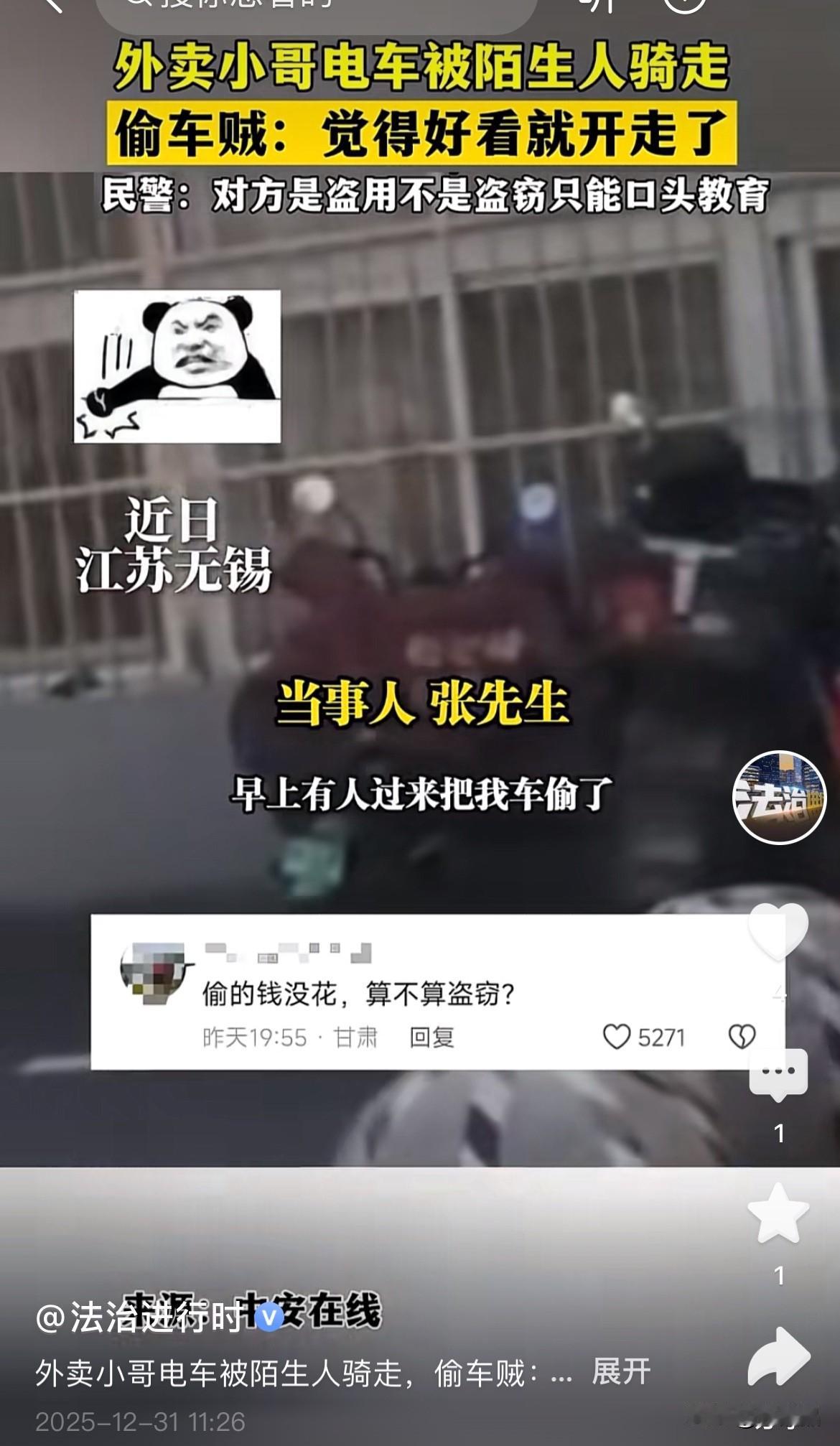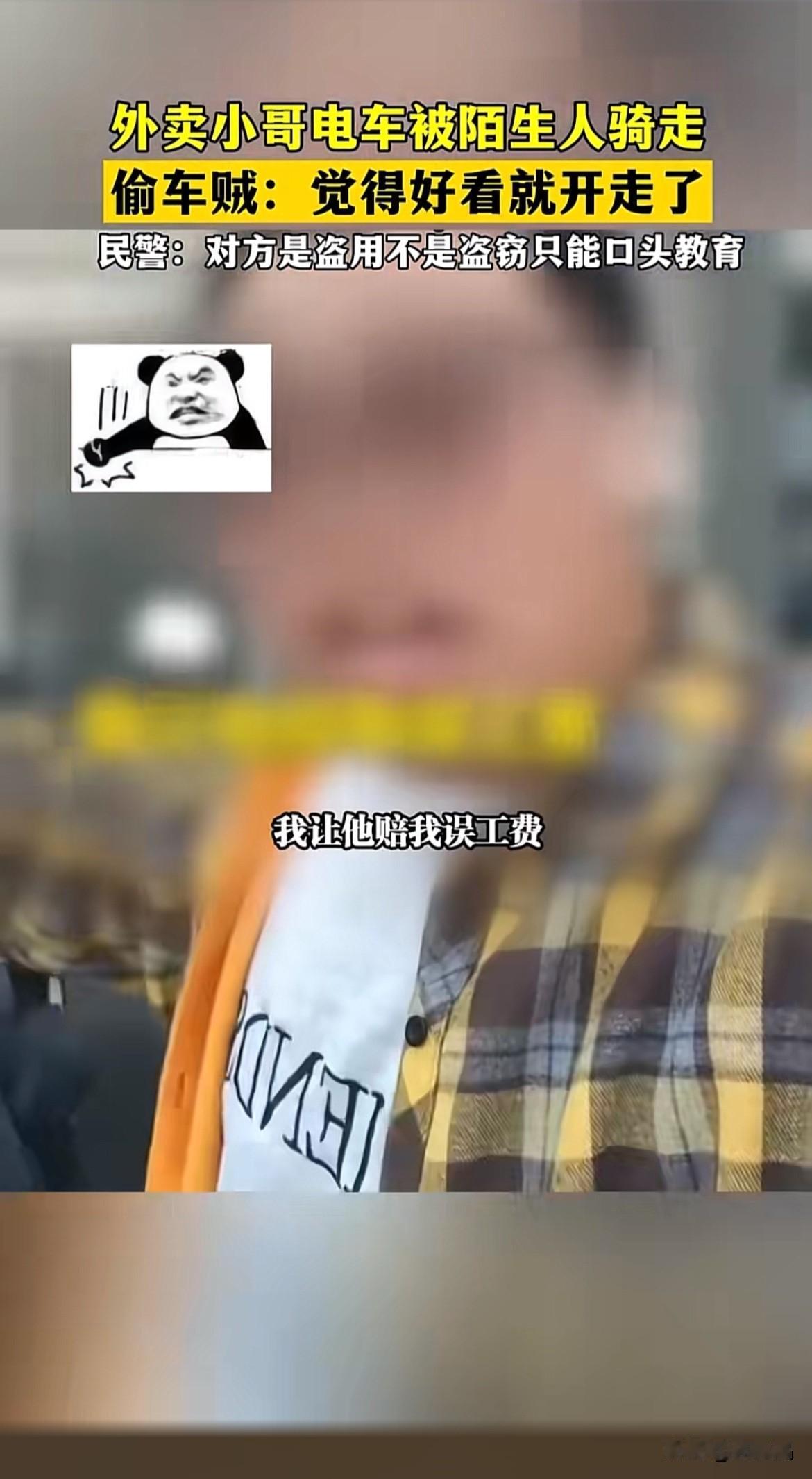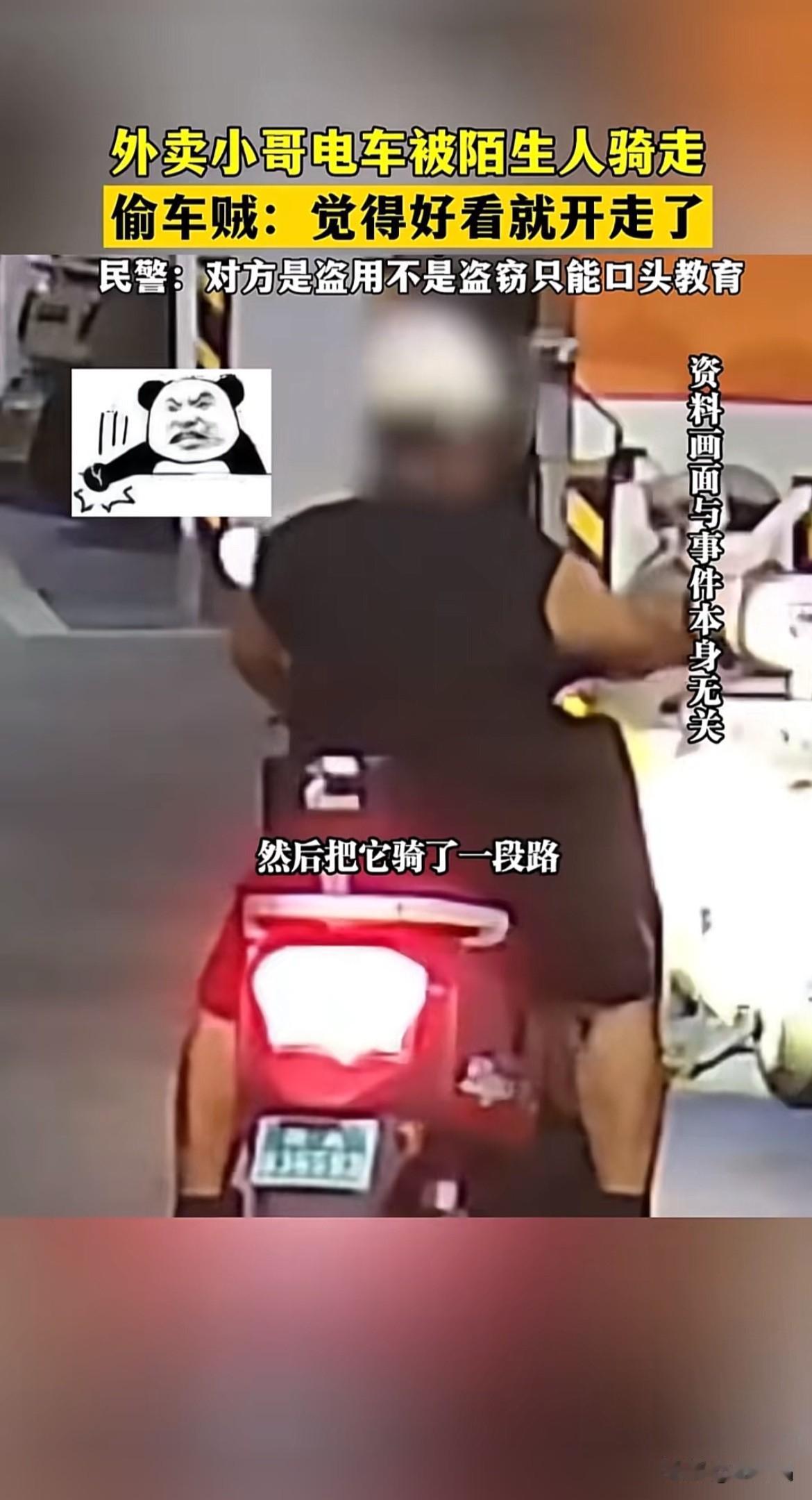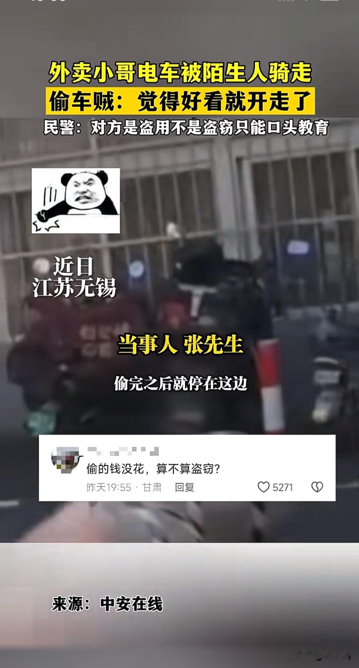 万万没想到!江苏无锡,一外卖小哥电动车被陌生人偷走,报警后偷车贼说觉得车好看就骑走了,更让人没想到的是,偷车贼只被口头教育一下就完事了。 外卖小哥如往常一样,骑电动车送餐时,随手停在楼下,钥匙没拔,就赶忙去送餐,没想到送完餐回来,发现车不见了,于是报了警。 民警通过调查,很快找到了外卖小哥的电动车和抓到了偷车贼。 偷车贼对其偷车行为供认不讳,声称:我觉得车好看就骑走了。” 外卖小哥要求偷车贼赔偿误工费,偷车贼拒绝赔偿,对此,民警给出的处理是只能口头教育,因为没有充足证据证明偷车贼偷车后进行买卖或者私下交易获利,只能算盗用,不能算盗窃。外卖小哥对此难以接受。 此事引发网友热议,表示质疑:偷了没卖就不算偷了?只是口头教育,犯罪代价未免太低了。 不管偷盗后是否买卖获利,但偷了就是偷了,这个行为就是违法的,简单的口头教育,难以服众,此事引发了大家对法律盗窃和盗用界限深入思考。 对于外卖小哥而言,他每日风里来雨里去,电动车就是他谋生的重要工具。车被偷导致无法正常送餐,损失的不仅是当次的订单收入,还有可能面临被平台的处罚和扣款。而偷车贼仅仅因为一句“觉得车好看”就轻松骑走别人的车,最后只换来轻飘飘的口头教育,这公平吗? 从法律层面看,或许确实需要证据证明有买卖获利才能判定为盗窃,可这也给了一些不法分子可乘之机。他们完全可以打着“借用”“觉得好看骑走”的幌子肆意妄为,反正只要不涉及交易获利,就不会受到严厉惩处。 这件事也暴露出法律在实际执行过程中的一些漏洞。我们应该重新审视盗窃和盗用的界限,完善相关法律法规,让违法者受到应有的惩罚,也让受害者的权益得到切实保障。不能让这种模糊的界定成为犯罪行为的“保护伞”,只有这样,才能维护社会的公平正义和良好秩序。