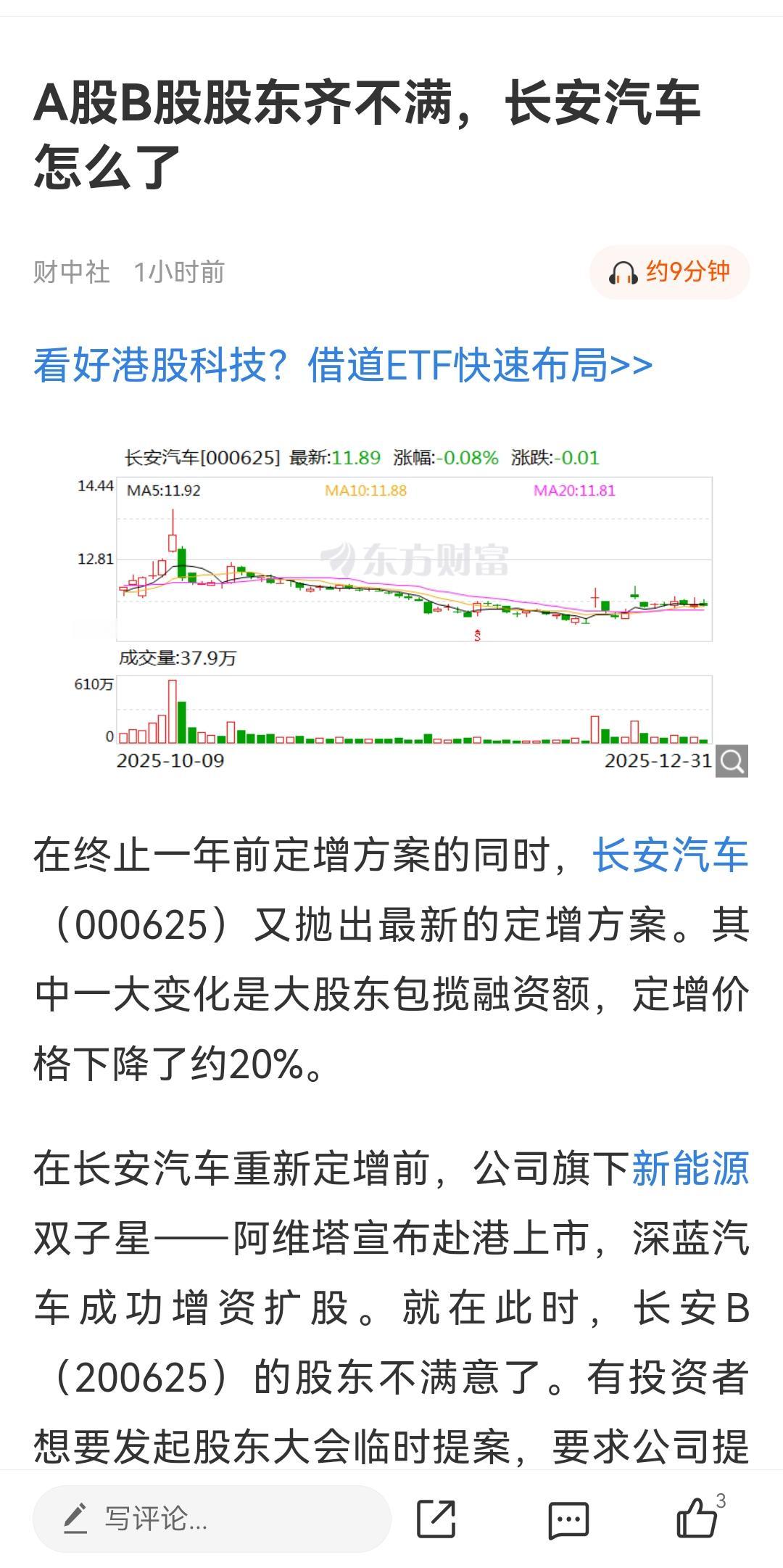 终于有知名财经媒体关注长安汽车问题了!《财中社》发文《A股B股股东齐不满,长安汽车怎么了》文章提出长安汽车2024年12月公布的定增预案中,长安汽车计划发行价为11.78元/股。而2025年披露的最新定增方案中,发行价格为9.52元/股,发行价下调19.2%,接近两成。两次定增定价基准都是前20个交易日A股成交均价的80%。仅仅一年之间,在牛市中长安汽车股价下跌了20%。 长安汽车“为了低价定增,大股东有没有故意做空股价”,这恐怕每个股东心里都有一把称,清楚是怎么回事,只是发不出来!能让股东齐齐不满,怨声载道,长安汽车到目前为止没有对此做任何回应!