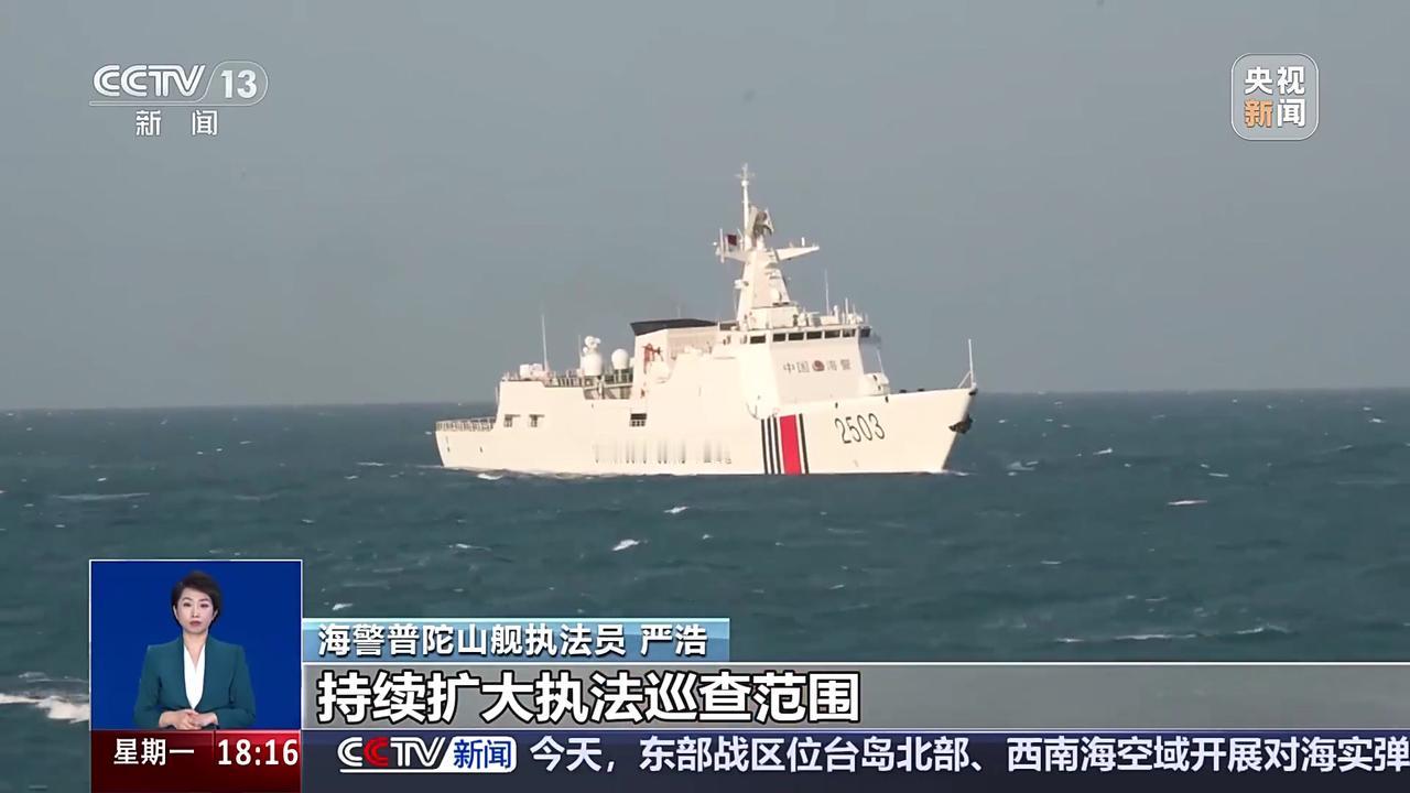 海警版052D首次参加围岛演习! 该舰为中国海警新型5000吨级执法巡逻舰朱家尖舰,采用的平台与海军的052D基本一致,不过其操控性比正版52d还强,舰艏两边侧面有喷水推进器,转弯掉头很快捷。