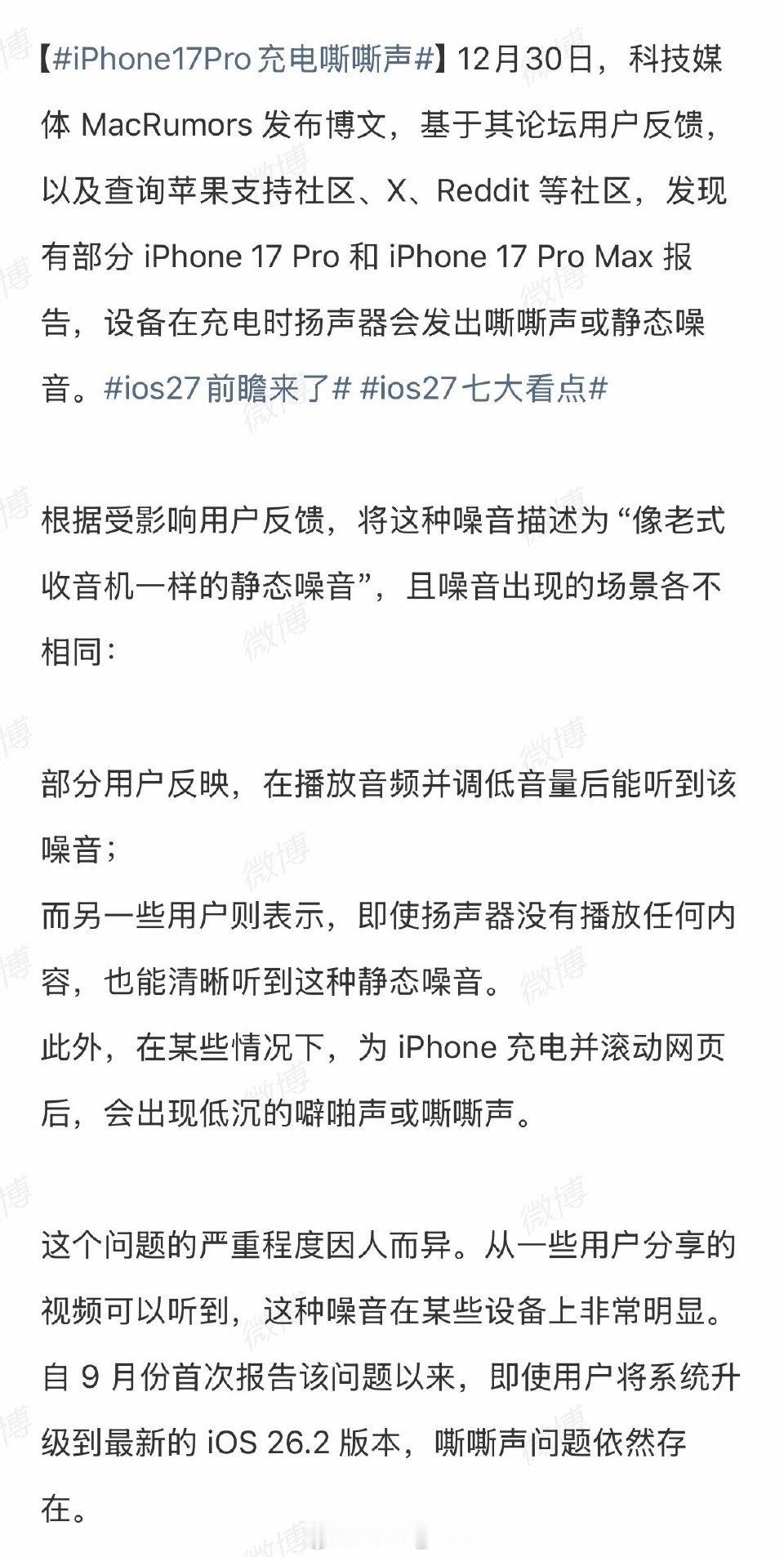 苹果回应iPhone17Pro充电嘶嘶声哈?这么离谱吗目前我手上的iPhone17ProMax一切正常哈,就是那个电池不耐用体感跟iPhone13PM差好多呀
