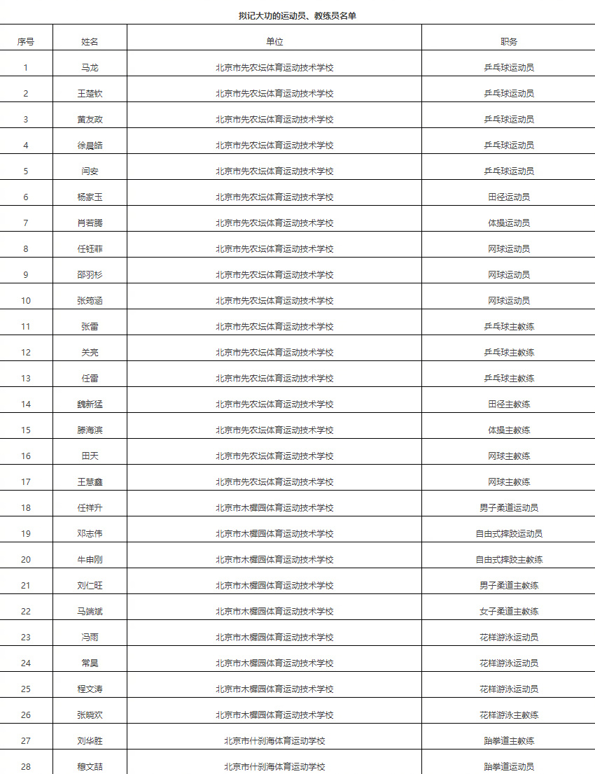 马龙王楚钦拟记大功 北京市体育局人事处发布《关于北京市参加第十五届全运会及时奖励拟记大功对象的公示》,确定北京乒乓球运动队、北京网球运动队等9个集体,马龙、、等28位同志拟记大功对象。具体名单如下↓ 北京乒乓球队拟记大功