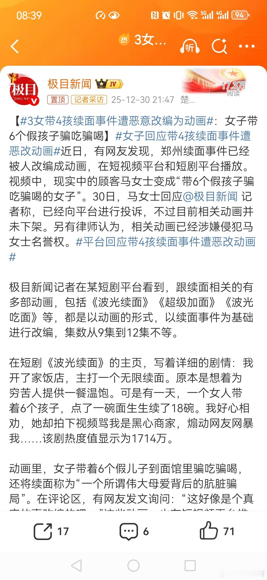 【3女带4孩续面事件遭恶意改编为动画女子回应带4孩续面事件遭恶改动画。平台回应带4孩续面事件遭恶改动画面馆老板其实说的对,做好一碗面比啥都强,而且要生存,生意不能倒下,道歉为代表了心胸和格局, 对于动画片,我觉得不要对号入座和过度解读,艺术创作有时是源自于多个事件的生活素材,而并非单一的,而且往往高于生活。 凡事一定要听取双方证词,再去了解事实过程才能下判断,续面事件那里,我也差点被带偏,不要随意站队,不要被带节奏,多一份理性和冷静去看待热点事件 我觉得这个事件可以翻篇了,都过去了,好好生活,没必要一直在各种诉讼中纠缠下去了,更没必要一直热搜下去,没有多大的实际意义,除非真的是为了流量。