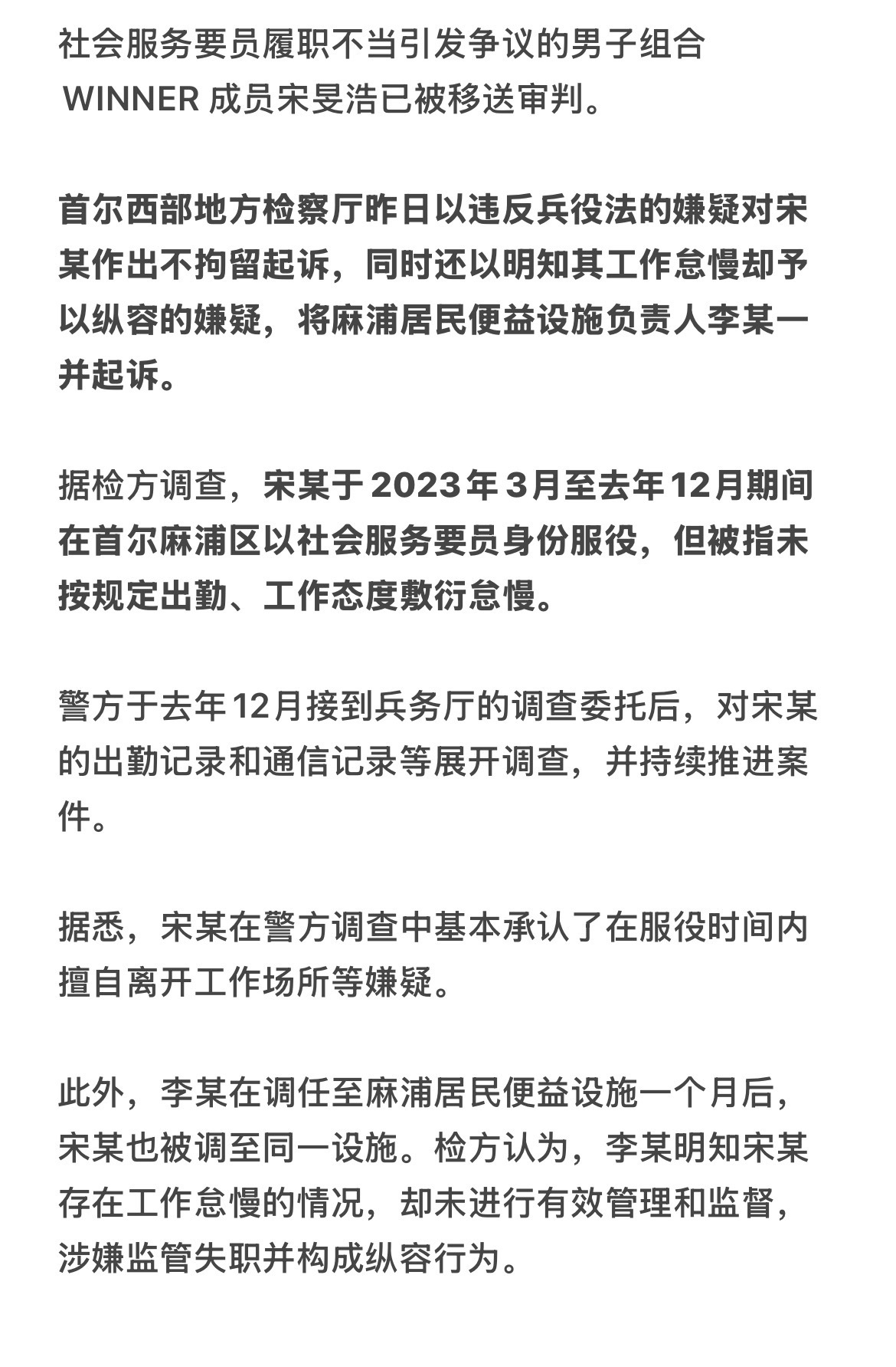 宋旻浩因服役争议被不拘留起诉。据检方调查,宋某于2023年3月至去年12月期间在首尔麻浦区以社会服务要员身份服役,但被指未按规定出勤、工作态度敷衍怠慢。据悉,宋某在警方调查中基本承认了在服役时间内擅自离开工作场所等嫌疑。宋旻浩因服役争议被起诉