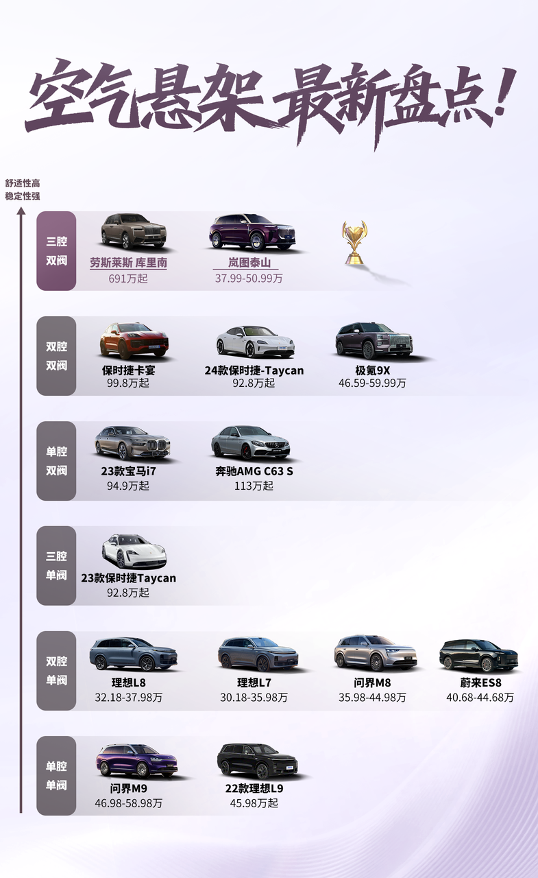 这才是舒适密码!各车都用啥悬架? 选车别只看品牌,想要舒适和稳定性,悬架才是关键!来看看现在主流车型都在用什么空气悬架 ✅顶配的三腔双阀有劳斯莱斯库里南和岚图泰山,调校细腻度拉满,舒适与支撑双在线 ✅双腔双阀有极氪9X、保时捷卡宴、24款保时捷-Taycan,适配多场景驾驶 ✅双腔单阀也是众多车型选择,理想L8、理想L7、问界M8和蔚来ES8,兼顾舒适与性价比,家用通勤无压力 ✅入门有又实用的单腔单阀有问界M9及22款理想L9,满足基础舒适需求,价格友好~ 其实不同悬架配置各有侧重,最终还是要匹配自己的车型定位和日常用车场景,按需选择最靠谱~ 三腔空悬 高端旗舰SUV 岚图泰山 库里南 极氪9X