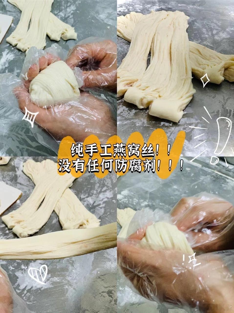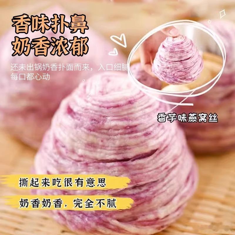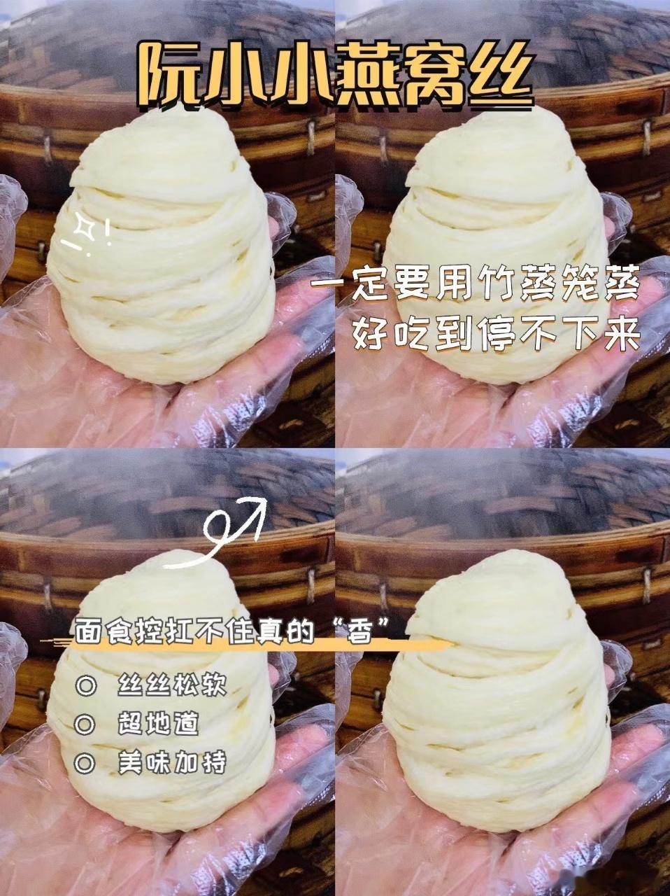 堪称一绝的早餐圣品,宜宾特色纯手工现做现发的燕窝丝粑粑,上锅蒸或者微波炉打一两分钟就能吃上的早餐,香甜软糯,跟在本地吃一个味,12个49.9元。燕窝丝/银丝卷 纯手工四川特产半成品川南的自贡富顺和宜宾,都有这种丝状的面点,燕窝丝、银丝卷都是它。湖南长沙也有类似的燕窝丝,但是做法不同,四川的燕窝丝在加入了猪油以后,让面食变得入口化渣。这是一个全手工产品,所以以前我认为不可能有标品,找了它好几年,跑了无数工厂都做不出来,现在终于有工厂愿意做了。表面丝丝缕缕盘成一团,莹白透亮形似燕窝,形状在制作的时候还很考手艺。面粉辅以白糖、化猪油、樱桃、蜜饯等,发酵后按压再拉成丝状,卷成燕窝丝状上笼蒸熟。松泡散软,香甜可口,带猪油香味。不同于通常的面食花卷,在形态,调味和口感上,燕窝丝纯手工0添加,呈丝状,里面外面随便拉几下都是丝丝,丝丝均匀分明层次丰富,奶香浓郁非常松软,香甜可口不腻。冷藏可以放15天冷冻60天,拿到手无需解冻,用沸水蒸5分钟或者用微波炉中火2-3分钟就可以快乐增加热量了。这个好物闭眼入