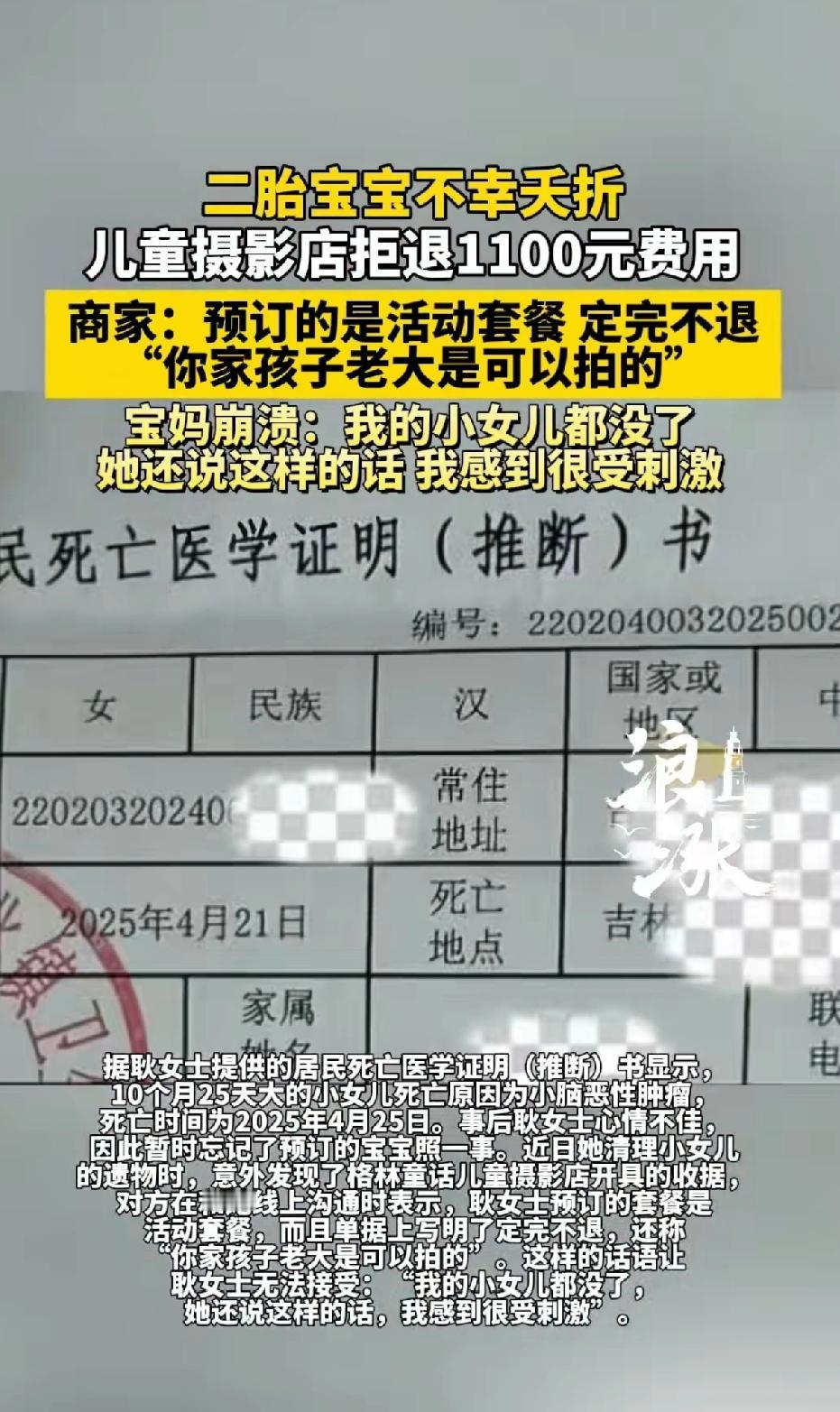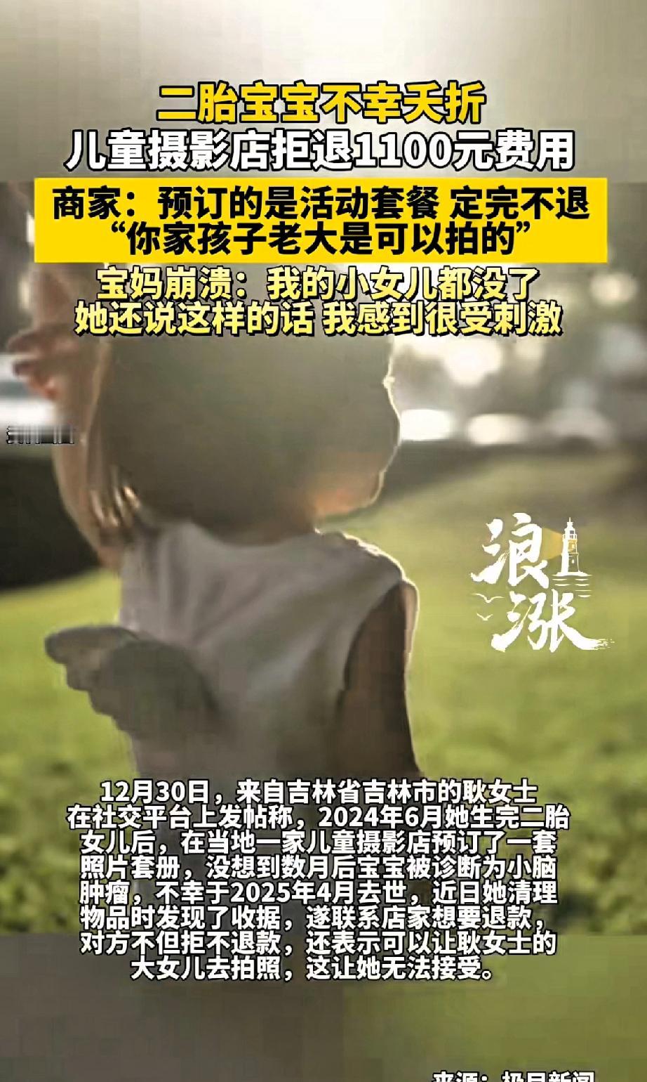 二胎宝宝不幸夭折,儿童摄影店拒退1100元费用,商家:预订的是活动套餐,订完不退。商家:“再说你家老大也可以拍”。 2024年6月份生完二胎的耿女士,在吉林市一家月子中心坐月子,当地一家名为“格林童话”的儿童摄影店上门免费为宝宝拍月子照,经过对方游说又购买了1100元一套百天照加周岁照套册。很多月子中心都有摄影中心免费送的首套月子照。 另耿女士没想到的是,数月后小女儿患小脑肿瘤,不幸于2025年4月去世。近日她清理物品时发现收据,随后联系商家说明情况,想要退款,店家不但拒绝退款,还表示可以让耿女士的大女儿去拍照,这让她无法接受。 这儿童摄影店的做法也太让人寒心了。二胎宝宝夭折,这对父母来说是多大的打击,他们心里得多痛苦啊。 可摄影店倒好,因为是活动套餐就拒绝退还 1100 元费用。还提人家老大,这不是往人伤口上撒盐嘛。虽说提前说好的不退,但情况确实特殊。 妈妈崩溃:我小女儿都没了,他还说这样的话,我感觉很受刺激。 店家让人家老大用这个套餐,人家本来是给老二订的,现在老二没了,父母不知道要花多长时间,才能走出来。 再去用这个套餐给老大拍照,又会想起当初订这个套餐的初衷,为了1100元揭人家伤疤,商家真是没下限。 商家就只盯着那点利益,完全不顾及顾客的遭遇。做生意要讲诚信和人情味,这种情况下就该体谅顾客,把钱退给人家。这 1100 元对商家来说可能不算啥,但对正经历痛苦的家庭来说,早日退款,不要让人家徒增痛苦,才是店家该做的。