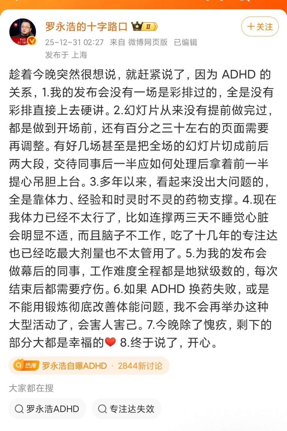 #罗永浩自曝ADHD##罗永浩自费捐出原门票收入166.88万元#罗永浩在发布会后解释活动延迟开始,是因为自己有ADHD注意缺陷多动障碍。客观而言,这次拖堂,也确实给很多观众带来不便,比如活动有4000多人参加,如果按照原计划晚上7点开始,可以在晚上9点多10点结束。我相信这4000人多数是乘坐公共交通过来的,那么这个点,还是能乘坐地铁回去的。但最后好像是11点--12点结束的。地铁肯定是没有了,只能打车了。同一个地点同一时间,几千人打车,不仅打不到,价格也会很贵。不过,说开了就好了,昨天我在活动现场和现场群里,都听到看到有人说,理解万岁。就是相信罗永浩和他的团队肯定是努力做好这场活动,但是呢也碰到一些短时间克服不了的困难。