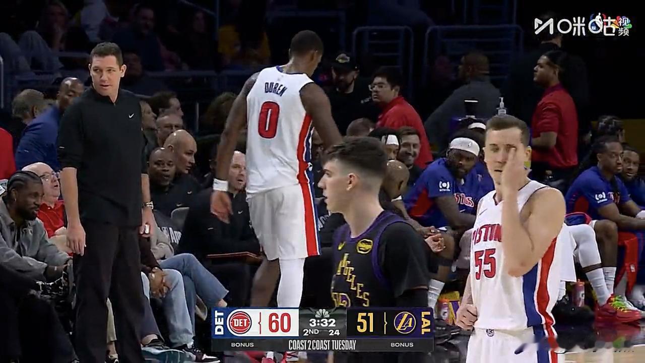 岁月静好,詹姆斯已老,41岁老詹生日快乐!半场湖人队65-70落后活塞队5分,詹姆斯罚球5中2,东契奇22分 今天上午11:30,NBA常规赛湖人队主场迎战活塞队,上半场结束湖人队65-70落后活塞队5分,内线得分活塞队46:22,优势明显,上半场湖人队12次失误,三分球18中7,52.5%投篮命中率,活塞队三分球7中4,投篮40中27,67.5%投篮命中率,詹姆斯出场18分钟18秒,三分球5中3,两分球4中2。罚球5中2,罚球有点不准,得到15分1篮板4助攻1盖帽3失误,东契奇12中6得到22分3篮板5助攻。 活塞队康宁汉姆13中9得到20分1篮板8助攻