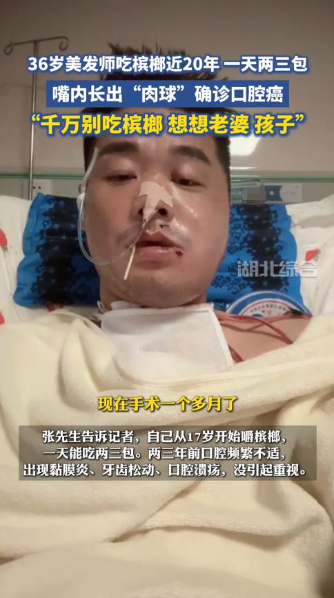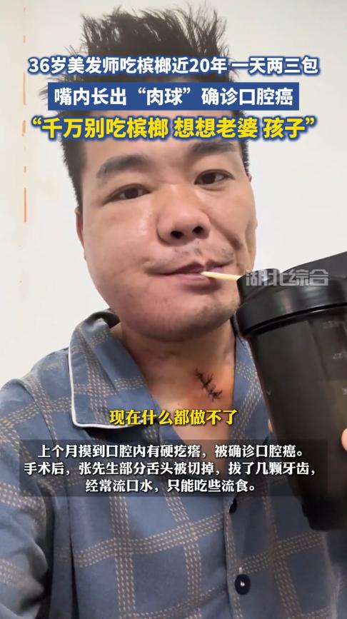 “还敢吃槟榔吗?”广东中山,一男子嚼槟榔近20年,两年前牙齿变得松动,口腔也频繁出现炎症,但是男子并未在意,直到上个月,他感觉嘴里面有肿块才去医院检查,最终确诊为口腔癌!如今只能吃流食。网友:真是理解不了! 在南方地区,槟榔是非常常见的,不少人都喜欢嚼这个,感觉吃的时候特别有精神,可是时间一长,吃槟榔的危害就显现出来了。 据媒体12月31日的报道,张先生特别喜欢吃槟榔,从17岁那年就开始吃,如今已经快20年了,虽然很早之前他就听说了嚼槟榔的危害,可还是管不住自己的嘴,有时一天甚至要吃3包! 2023年时,张先生总是上火,嘴巴里有很多溃疡,牙齿也松动起来,可是这些都没有引起他的重视,依旧每天坚持吃槟榔。 直到上个月,张先生发现嘴里有一个硬疙瘩,这才想起来去医院检查,最终被诊断为口腔癌!听到这个噩耗,张先生久久无法恢复平静,没想到这一天还是来了,他后悔没有早点来做检查。 如今,手术已经过去一个多月了,张先生的舌头被切掉了一部分,牙齿也被拔掉了许多,只能依靠流食勉强维生。 张先生原本经营着一家美发店,有两个孩子要养,可如今他什么都干不了,流下了悔恨的泪水! 网友看后表示,别人劝再多都没有用,只有自己真的经历了,才知道与多么痛苦,可是后悔已经来不及了。 信息来源:《6岁广东男子从17岁开始食用槟榔近二十年,两年前起,他口腔频繁出现炎症、牙齿松动及溃疡,但未引起重视。直至上月发现口腔内有硬块,经检查被确诊为口腔癌。男子表示,希望通过自身经历告诫公众:“槟榔害人害家,吃之前想想老婆孩子。”》闪电新闻