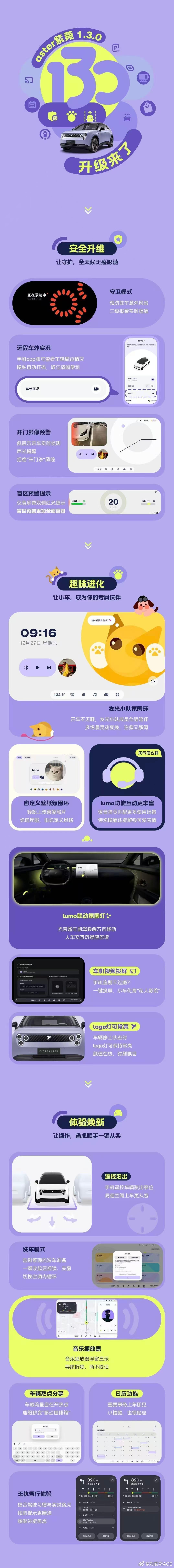 我的车友们!来!OTA来了!aster紫菀1.3.0今天正式推送!本次升级,涵盖智能辅助驾驶、智能座舱、智能伙伴lumo及整车体验四大方面!1. 守卫模式开启并激活后,为爱车带来更全面的安全感!2.遥控泊出,在偶遇狭窄或环境不便上车的场景时,这个功能我说真的等好久了!3. 新增两位「发光小队」成员做懂你的情绪搭子——小咪橘长和小汪贝比