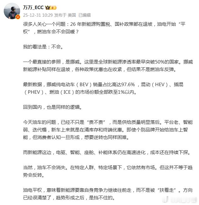 油车同权?燃油车还能焕发第二春么?“不能”这个答案就像老师说的那样,几乎不会有什么变化,就类似于人口出生率会大幅度攀升么?房价会极速上涨么?大A会大幅攀升么……这些答案的改变其实并不来源于单个政策的影响,核心在于受众的意识已经改变了。目前,消费者选择新能源汽车的核心其实是为新的产品力所影响,车购税优惠只是一个促成交易的刺激因素,远远达不到决定性因素,汽车毕竟是大宗消费品,并不会因为10%的车购税产生根本性偏离,这个螺距举个例子说的更清楚:电车A和油车B,价格差不多,功能差不多,但是电车有车购税优惠,那么可能消费者会优先选择A。电车A和油车B,价格差不多,功能电车好太多,即便电车和油车一样收税,你说消费者会选什么?难道是为了省几万块,花几十万买一辆不好用不开心的车么?所以,答案必然是“不能”。新能源汽车明年购置税补贴退坡电车怎么买