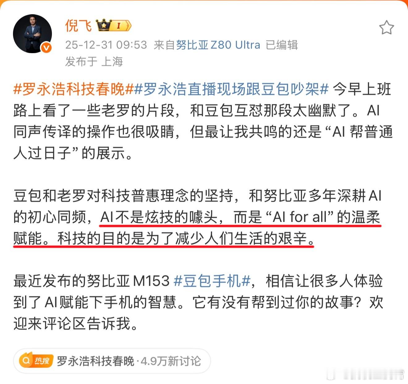 努比亚总裁倪飞点赞罗永浩昨天罗永浩科技春晚看下来,让我印象最深的还得是老罗和豆包辩论互怼那段,可以看出来AI聊天多自然,一点不生硬,尤其后面AI帮助普通人那几个片段,确实让我很感动,你不得不感叹如今的AI真是太强了。当然也可以预见,努比亚联合豆包推出努比亚M153豆包手机这条路算是走对了,AI手机肯定是大趋势,现在的AI手机早不搞花架子了,都是实打实在帮我们办事、省时间,让“AI帮普通人过日子”照进现实。显然AI不再是遥不可及的科技,而是贴心帮手,用着特顺手,我觉得这才是AI该有的样子