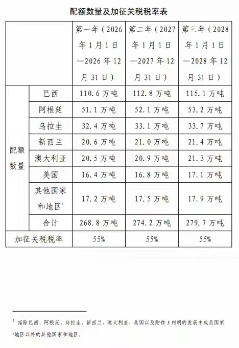 商务部对进口牛肉加税,保护本国行业央视新闻报道根据《中华人民共和国保障措施条例》(以下称《保障措施条例》)的规定,2024年12月27日,商务部(以下称调查机关)发布2024年第60号公告,决定对进口牛肉(以下称被调查产品)进行保障措施立案调查。调查机关对被调查产品进口数量是否增加、是否对国内产业造成损害及损害程度,以及进口数量增加与损害之间的因果关系进行了调查。现本案调查结束,根据《保障措施条例》第十九条、第二十条规定,调查机关作出裁定。现将有关事项公告如下:一、裁定调查机关裁定,进口牛肉数量增加,中国国内产业受到严重损害,且进口产品数量增加与严重损害之间存在因果关系。二、实施保障措施根据《保障措施条例》第十九条规定,保障措施可以采取提高关税、数量限制等形式。商务部根据调查结果,决定以“国别配额及配额外加征关税”的形式对进口牛肉采取保障措施。保障措施实施期限为3年,自2026年1月1日至2028年12月31日。保障措施在实施期间内按固定时间间隔逐步放宽。根据《保障措施条例》第二十条规定,商务部向国务院关税税则委员会提出对规定数量之外的进口牛肉加征关税的建议,国务院关税税则委员会根据商务部的建议作出决定,对规定数量之外的进口牛肉在现行适用关税税率的基础上加征关税,加征关税税率为55%。被调查产品具体描述如下:被调查产品名称:牛肉。英文名称:Meat of bovine animals。产品描述:被调查产品活牛(牛属)经屠宰加工后的牛肉产品,包括鲜、冷或冻的整头及半头牛肉、带骨牛肉以及去骨牛肉。该产品归在《中华人民共和国进出口税则》:02011000、02012000、02013000、02021000、02022000、02023000。三、执行保障措施的方法自2026年1月1日起,进口牛肉未超出规定数量(见附件2)的,进口经营者在进口牛肉时,按现行适用关税税率缴纳关税,上一年度内未使用完的配额数量不结转至下一年度。自进口牛肉达到规定数量(见附件2)的第3日起(含当日),进口经营者在进口牛肉时,应在现行适用关税税率的基础上加征55%关税。保障措施实施期间,《中国—澳大利亚自由贸易协定》中规定的牛肉特殊保障措施暂停实施。四、发展中国家(地区)的排除对于原产于发展中国家(地区)的产品,如其进口份额不超过3%,且这些国家(地区)进口份额总计不超过9%,不适用保障措施。不适用保障措施的发展中国家(地区)名单见附件3。实施保障措施的3年期限内,如被排除适用的发展中国家(地区)某一年的进口份额超过3%,或这些国家(地区)进口份额总计超过9%,可从次年起对其产品适用保障措施。五、复审保障措施实施期间,商务部可以根据有关情况的变化,依法审查保障措施的形式和水平。本公告自2026年1月1日起执行。
