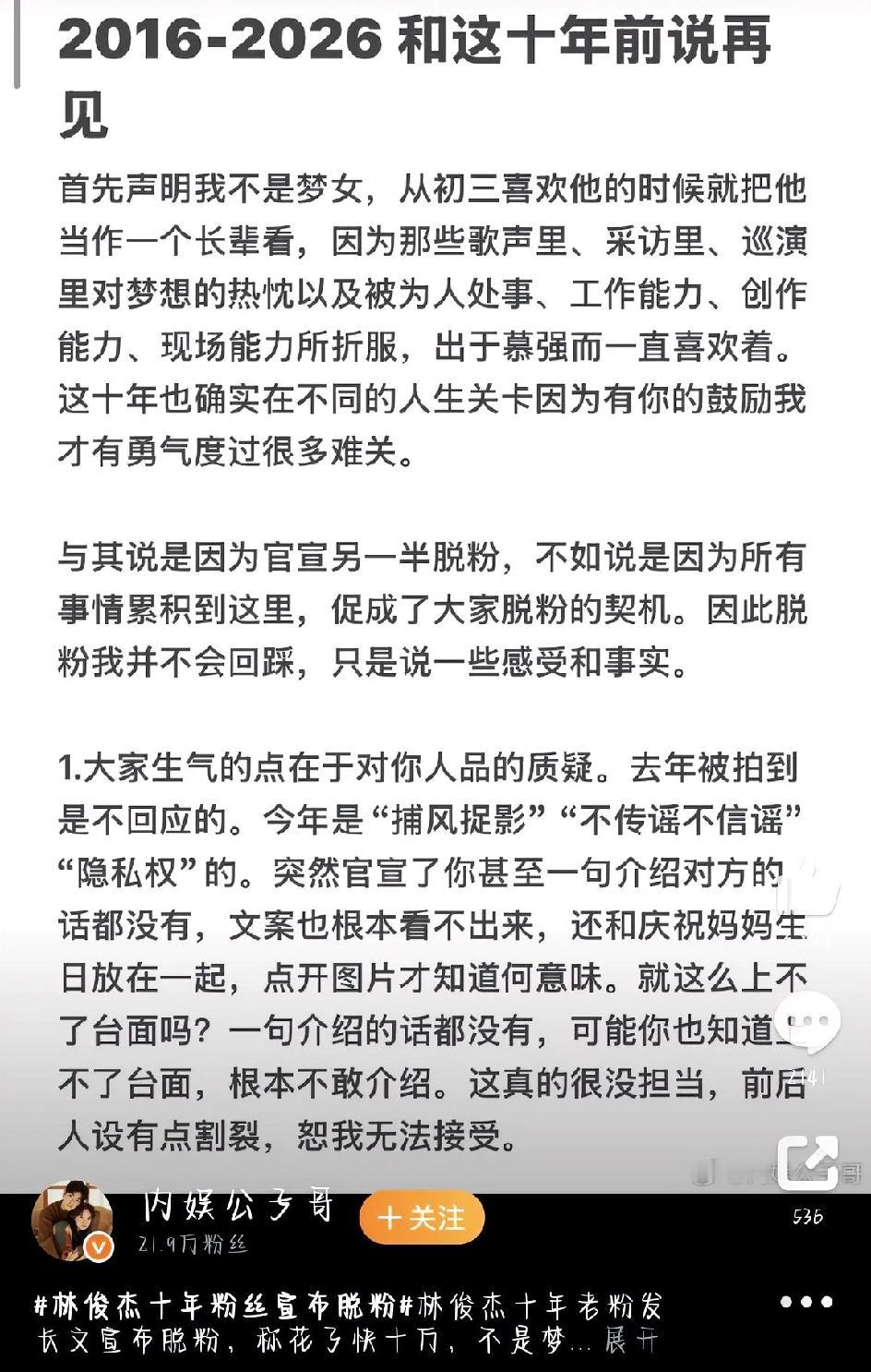 娱乐圈近期风波不断,林俊杰十年粉丝宣布脱粉 一事登上热搜,令人既感慨又唏嘘。一位追随林俊杰整整十年的老粉丝,发布长文与偶像告别,称自己这些年来为追星投入近十万元,从未怀有恋爱幻想,只是单纯欣赏他的音乐与公众形象,如今却难以为继。 事件的导火索,是林俊杰于12月29日借母亲70大寿之机公布恋情。44岁的他晒出全家福,23岁的网红女友“七七”正式亮相,两人年龄相差21岁。原本看似值得祝福的喜事,却在网友的深度挖掘下迅速反转。女方此前被称为“美籍华裔白富美”,但其海外社交账号中不乏衣着暴露的擦边照片,连王思聪也曾点赞相关内容,“网红”身份由此坐实。 更令粉丝心寒的是后续爆料。疑似林俊杰前女友的台湾女演员在社交媒体连发六个呕吐表情,疑似暗示其劈腿;另有知情人士透露,林俊杰与前任于2023年下半年分手,而他与七七相识于2023年底,时间线重叠引发猜测。加之林俊杰早年曾表示“不接受年龄差超过12岁”,如今却与小21岁的女友公开,其长期经营的“深情”人设骤然崩塌。 在那篇宣告脱粉的长文中,十年老粉的失望与疲惫溢于纸面。从《编号89757》到最新单曲,她追遍五场演唱会,集齐所有专辑版本,为反黑熬夜撰文,省吃俭用支持销量,甚至因偶像一句“欣赏有才华的人”而苦练钢琴至指尖生茧。然而官宣后接连爆出的争议,让她惊觉自己追逐十年的,或许只是一个被精心包装的幻象。 尤其令老粉丝心冷的是,七七早已场场占据演唱会VIP首排座位——那是普通粉丝即便高价也难以企及的位置;官方周边礼盒中隐藏的“77 Design”字样,被怀疑由女方参与设计,仿佛粉丝的每一分支持,都在无形中为偶像的爱情铺路。加之女方曾被披露接洽赌博网站广告等负面消息,这一切都让老粉无法再说服自己继续坚持。 此事在网络掀起广泛争论。有人认为粉丝过于严苛,偶像恋爱本是私事;但更多声音则对老粉表示共鸣:“我们反对的不是他恋爱,而是他亲手打破自己立下的原则,让十年信仰一夕崩塌。”近十万元的付出、十年的倾心相随,任谁都希望这份寄托值得。 说到底,追星追逐的从来都是自己心中的一束光。当这束光被现实刺穿、滤镜破碎,告别也就成了必然。愿每位追光者都能记得:爱任何人之前,先好好爱自己;再深的喜欢,也不应失去自我。而林俊杰在“深情”滤镜碎裂之后,能否以音乐重新赢得人心,唯有时间能给出答案。 来源:内娱公子哥