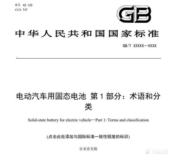 固态电池首个国家标准出炉 固态电池首个国家标准——《电动汽车用固态电池 第1部分:术语和分类》公开征求意见昨日出炉,其中明确了固态电池的相关术语、分类、编码等基础内容。新的意见稿在分类问题上更加严格,原先的“半固态电池”称呼不再沿用而是代之以“固液电池”的叫法,同时还提出了根据电解质类型(硫化物、氧化物、聚合物、卤化物或复合材料)、导电离子类型(锂离子、钠离子等)和应用领域(高能量或高功率)的分类方法。另外,新意见稿中的验收标准也要更加严格:比如,在特定的真空干燥条件下,固态电池的重量损失率不得超过0.5%——作为对比,中国汽车工程学会今年早些时候发布的团队标准中,对应的阈值是1%。新能源汽车