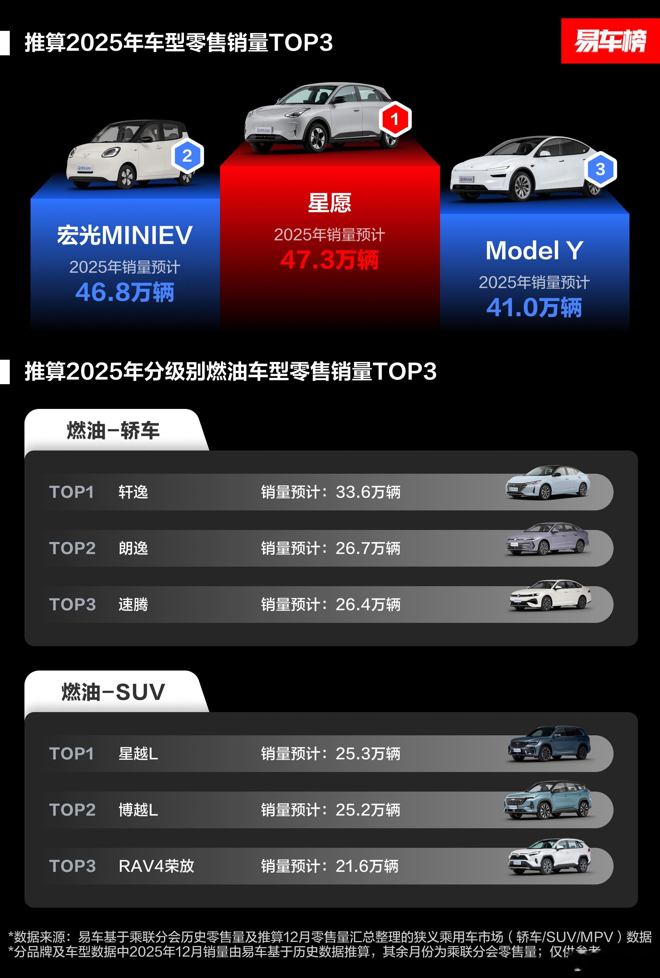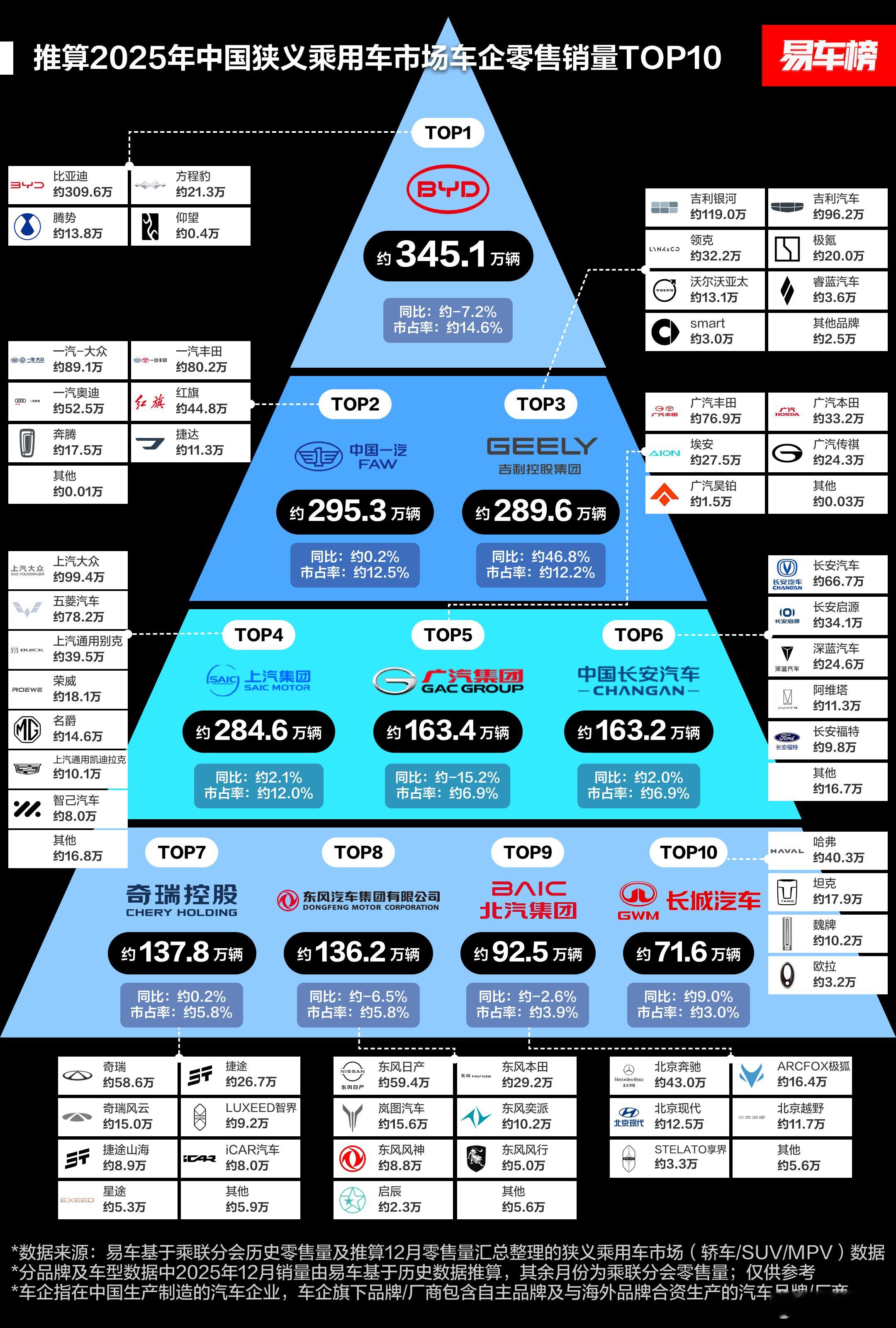 昨天提到了日经中文网对国内汽车市场销量态势的预测,我们今天来看看易车榜的统计。在他们的统计口径下:整体态势:国内狭义乘用车零售销量预计2368万辆,同比增长约3.9%。其中,新能源汽车渗透率将提升至54.2%,成为市场主流;中国品牌市占率预计达到65.5%,展现出强大的市场竞争力。车企销量表现:比亚迪预计销量最高,约为345.1万辆,市场占有率约14.6%;吉利汽车和吉利银河分别位列第二和第三,预计销量分别为295.3万辆和289.6万辆,市场占有率分别为12.5%和12.2%;此外上汽、广汽、长安、奇瑞、东风等派系也都占有相当的比例。品牌销量表现:第一名同样是比亚迪,约309.6万辆的成绩拿下大约13.1%的市占比;大众和丰田分别以约188.4万辆和157.0万辆的销量位列第二和第三,市场占有率分别为8.0%和6.6%。总的来看,2025年国内乘用车市场仍然延续着新能源转型和国产化的浪潮,整体销量小幅增长,新能源渗透率过半,国内品牌已经占据了主导地位。新能源汽车汽车资讯