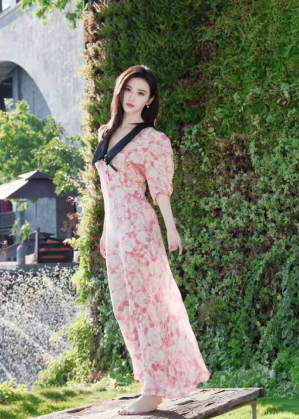 景甜粉色碎花裙写真太绝了,赤脚踩木台美成春日油画