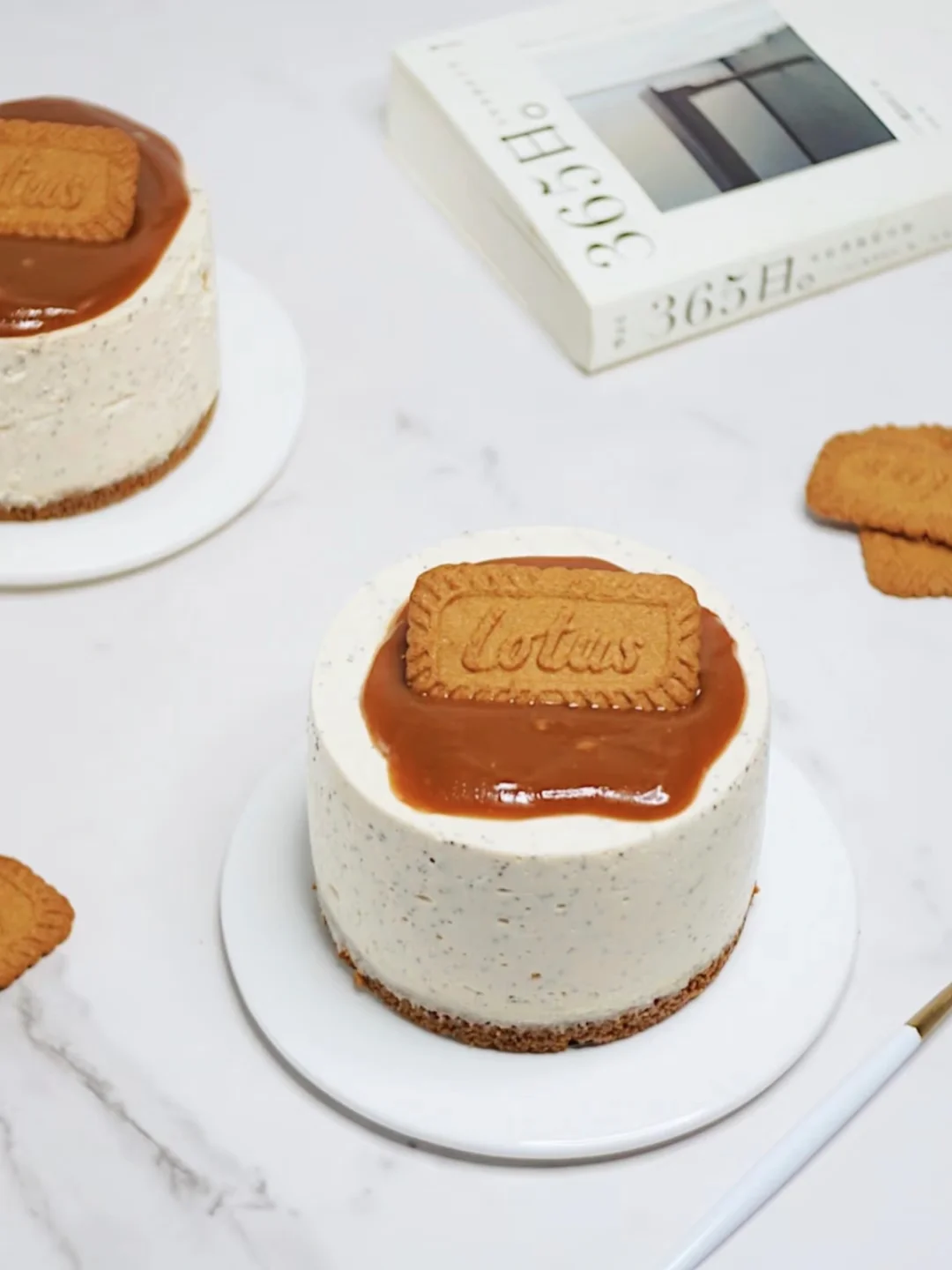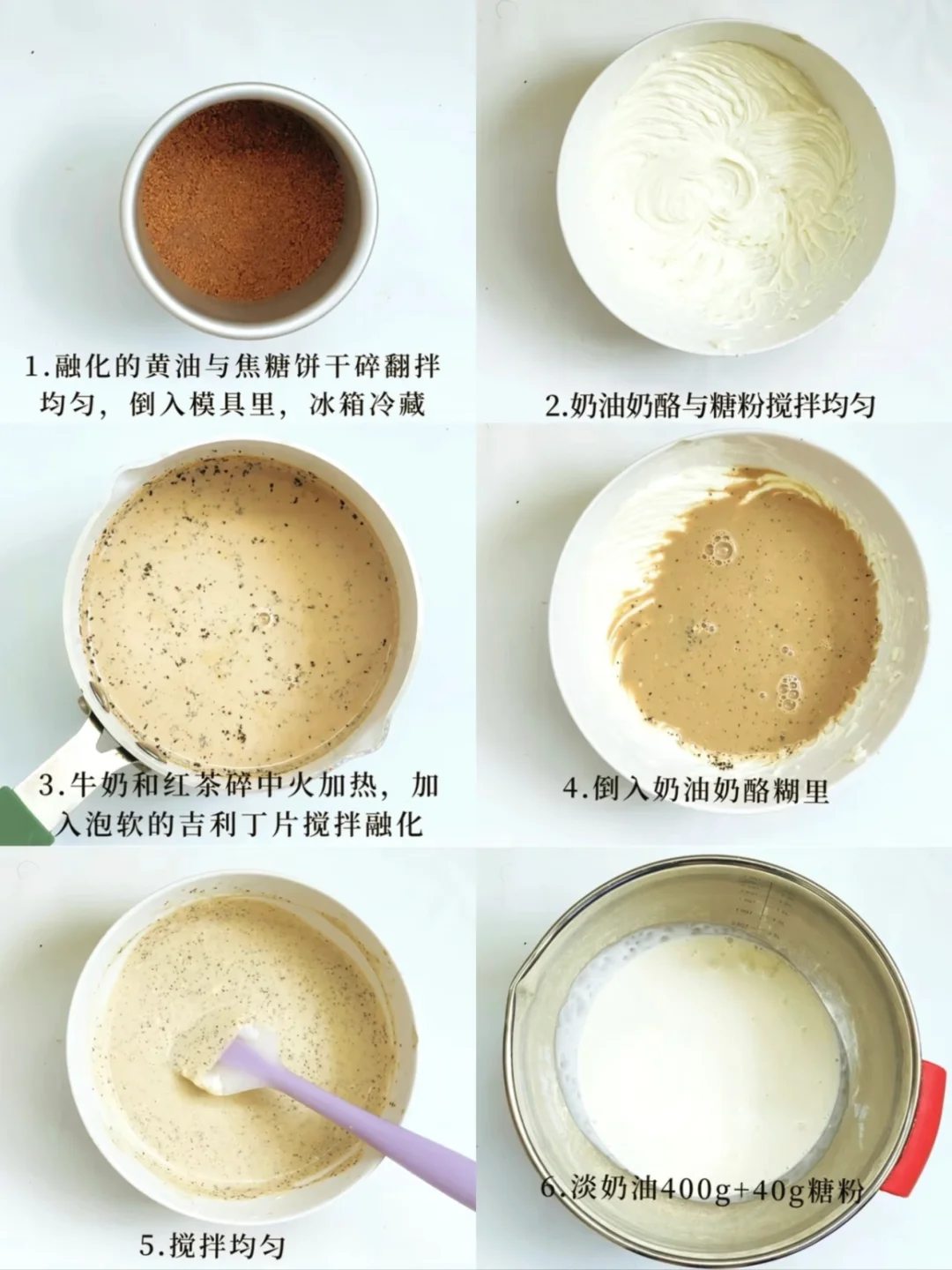 焦糖饼干打底,浓郁的红茶与奶酪糊搭配的恰到好处 搅一搅,拌一拌,放入冰箱冷藏 淋上浓稠的海盐焦糖酱 细腻顺滑,层次丰富,新手也能成功哦 · 👩🏻‍🍳【配方:】 焦糖饼干100g|黄油60g [烟花R]芝士糊:奶油奶酪240g|淡奶油400g|牛奶80g 细砂糖70g|吉利丁片15g|红茶碎6g [烟花R]焦糖淋面:细砂糖70g|温水15g|淡奶油60g|黄油16g|海盐2g · 👩🏻‍🍳【做法:】 1️⃣饼干碾碎与融化的黄油翻拌均匀,倒入模具里,压平放入冰箱冷藏 2️⃣奶油奶酪与30g细砂糖搅拌均匀顺滑,牛奶和红茶碎倒入奶锅里,中火加热煮出茶香,加泡软的吉利丁片,搅拌均匀,倒入奶酪糊里再次搅拌均匀 3️⃣淡奶油➕40g细砂糖打发至有纹路,浓稠的酸奶质地,与红茶奶酪糊翻拌均匀,倒入模具里。冰箱冷藏4个小时 4️⃣奶锅里倒入细砂糖和温水,中火熬煮到想要的琥珀色,离火以后缓慢倒入温热的淡奶油,继续小火加热,熬煮浓稠以后就可以离火。 5️⃣放黄油和海盐,利用余温,搅拌均匀融化,放凉 6️⃣冷藏好的蛋糕脱模,淋上放凉的焦糖酱 · ⚠️熬煮焦糖的时候,轻晃奶锅就可以,不要搅拌糖水,避免反砂;配方可以做2个4寸圆形,一个6寸高一点的