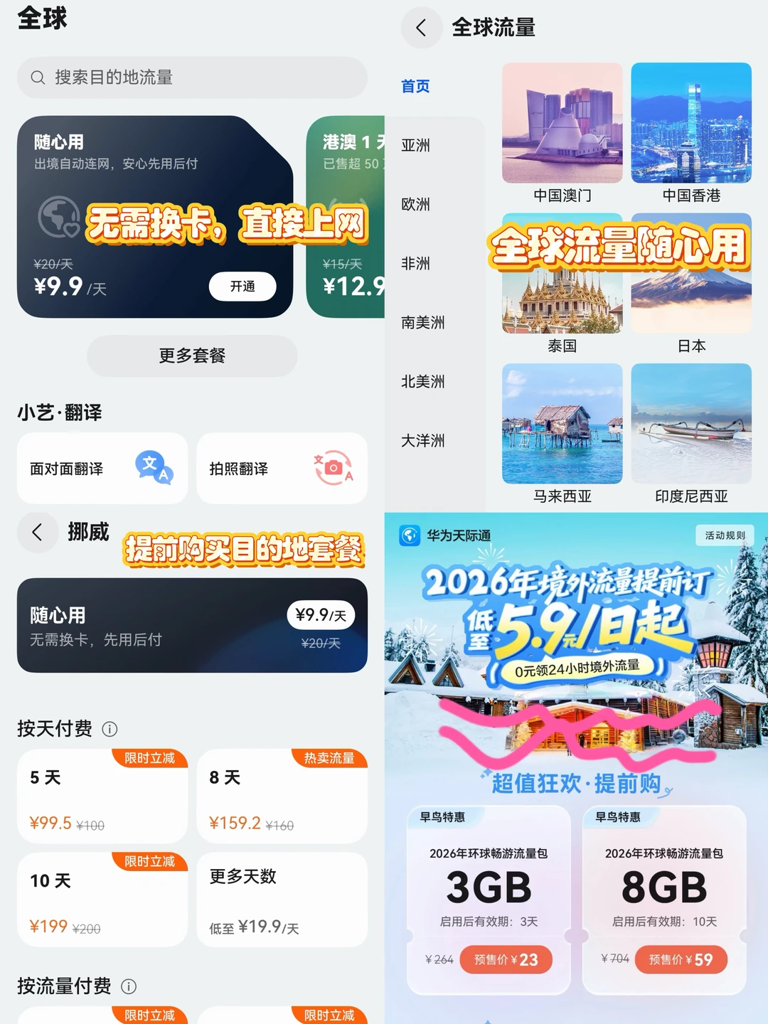 我们几个小伙伴出行,每次都用华为天际通,不需要换卡也不用开漫游,开通随心用,到了挪威直接就连接上了。很适合不想在境外上网方面费太多心神的我~而且网速又快又稳定,在上查看攻略、搜谷歌也很方便!元旦春节还有早鸟活动,最低每天流量只用5.9元,一杯奶茶钱就能搞定流量问题!还能领一天免费流量券,转机也完全没问题!