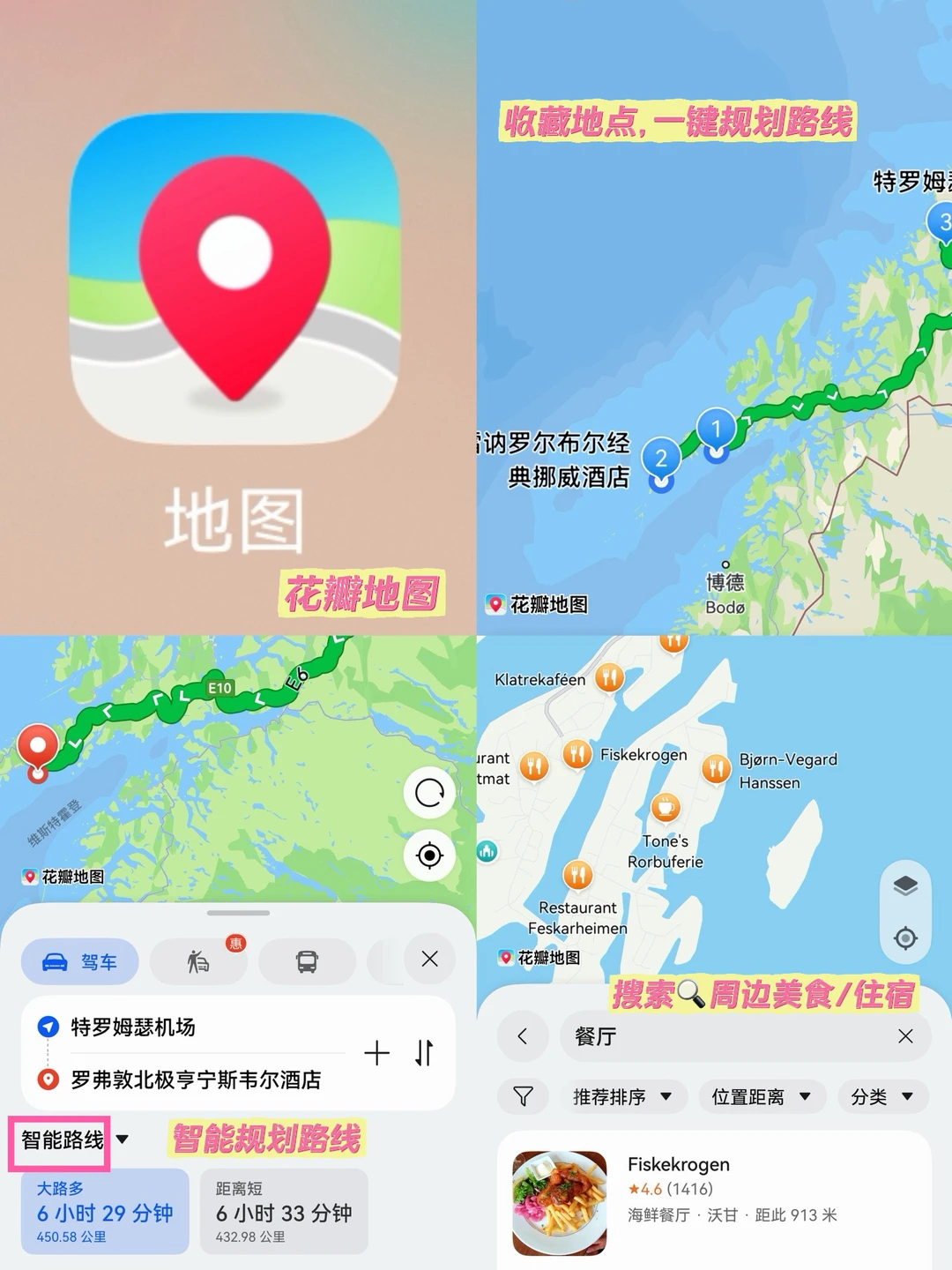 我用的花瓣地图,把行程收藏好它会自动帮我规划好行程,最重要的是中文语音播报导航,看不懂外语路标也不用担心找不到。定位很准,我们从特罗姆瑟到罗弗敦要开车一天很远很复杂,幸好花瓣地图每次还没到岔路口就及时提醒,不像某些地图走过了才提醒。