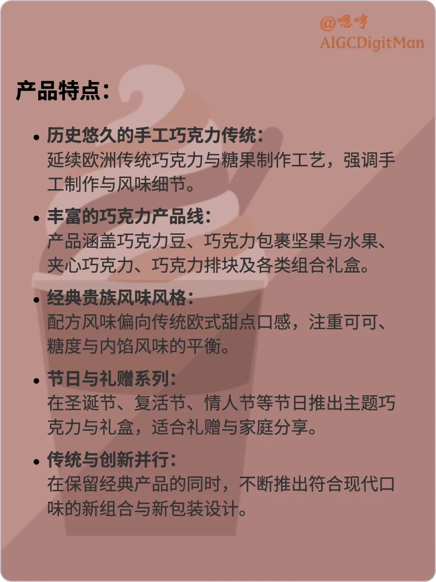 历史悠久的手工巧克力传统: 延续欧洲传统巧克力与糖果制作工艺,强调手工制作与风味细节。