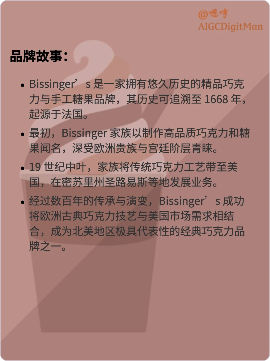 经过数百年的传承与演变,Bissinger’s 成功将欧洲古典巧克力技艺与美国市场需求相结合,成为北美地区极具代表性的经典巧克力品牌之一。