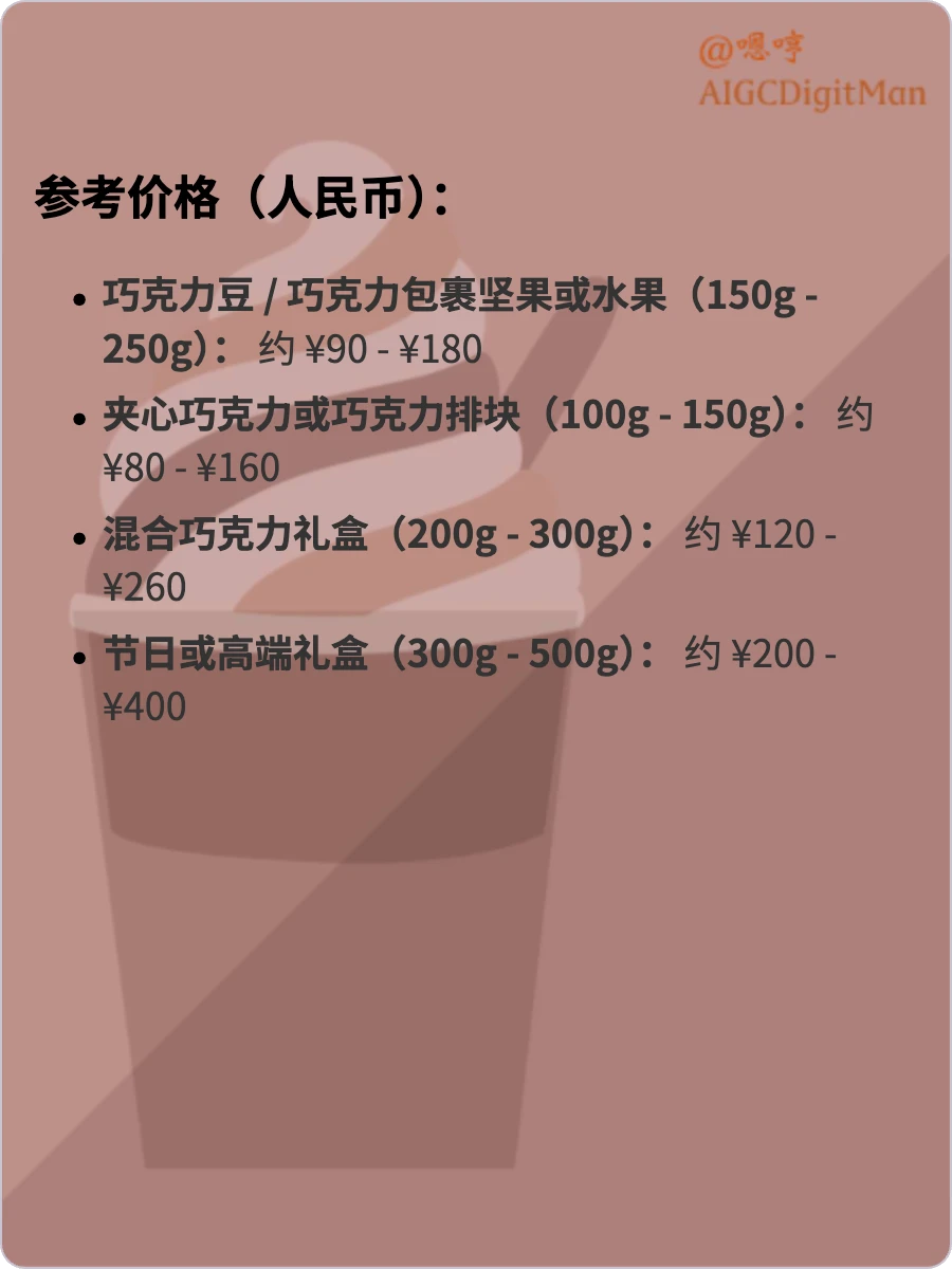 夹心巧克力或巧克力排块(100g - 150g): 约 ¥80 - ¥160
