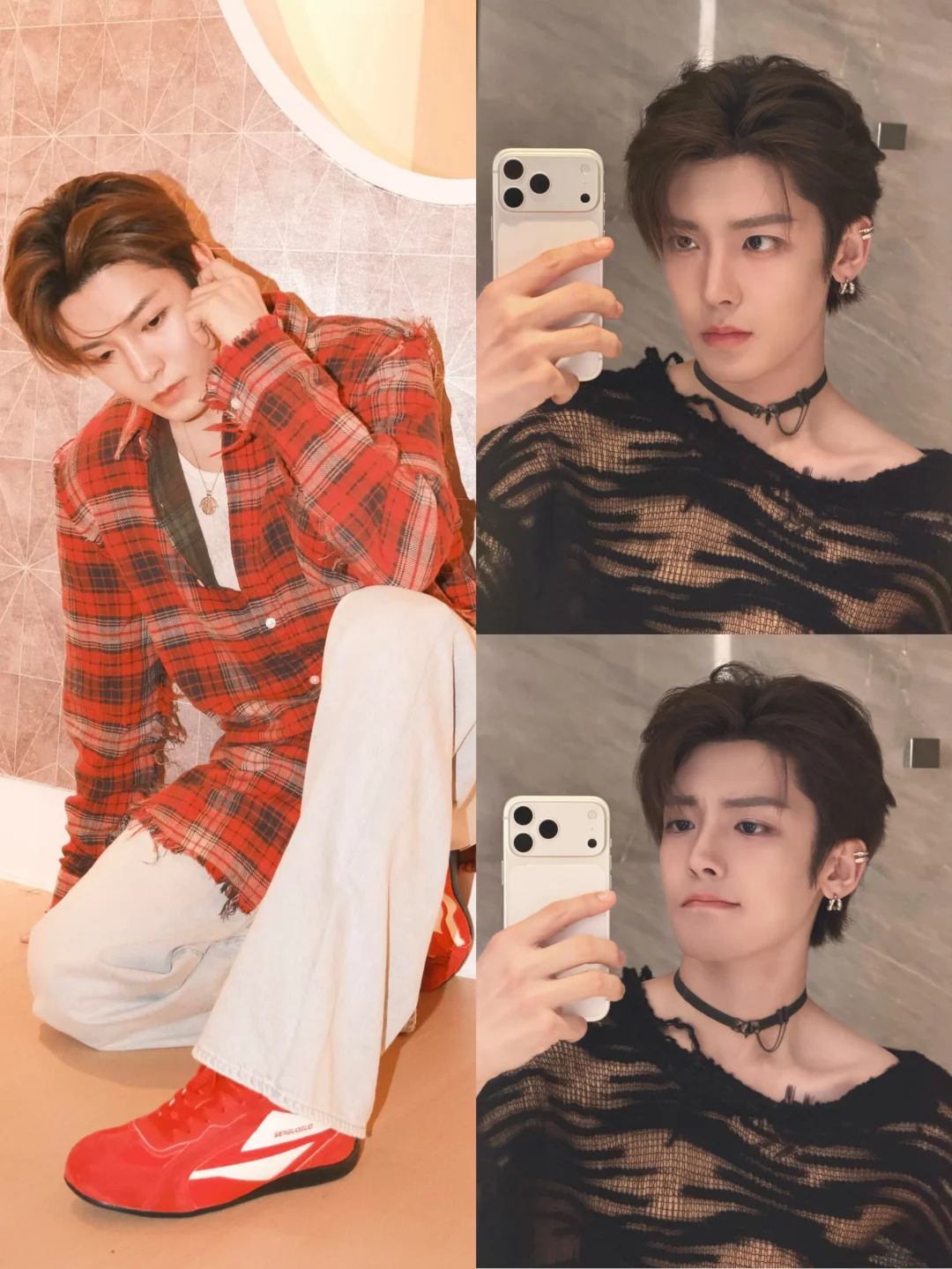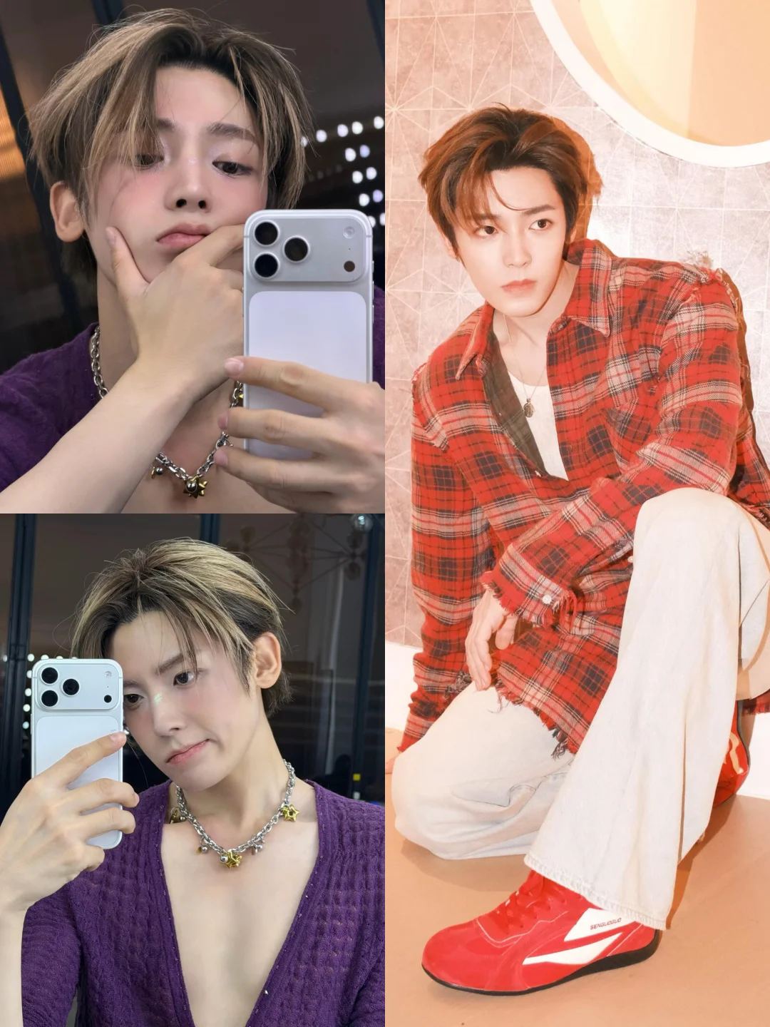 侯明昊请把你的库存都放出来, 此男自拍已经帅出天际, 刷到哥的杂志花絮直接心跳漏拍—— 紫色金属妆配湿发造型✨ 爱豆级别的神颜暴击啊!! 私服模式又切换休闲潮男🧢 红色格纹衬衫搭配森果果德训鞋 清爽少年感扑面而来 是谁被这种百变气质拿捏了我不说🤫 侯明昊请你保持这个发图频率! 图片cr: