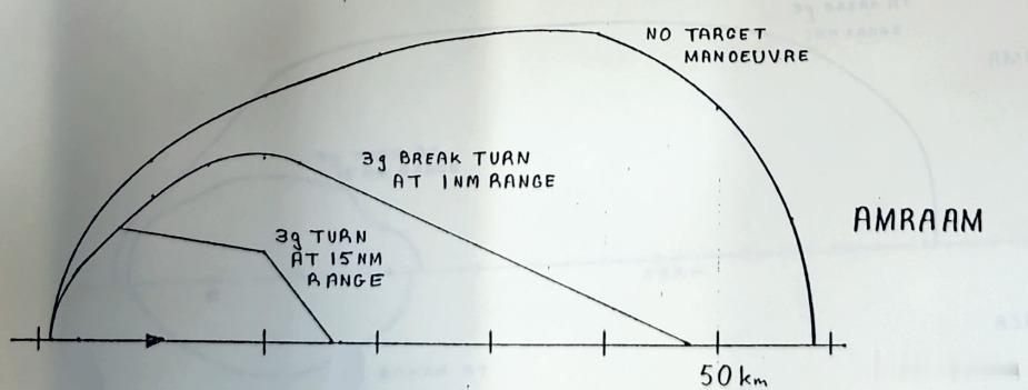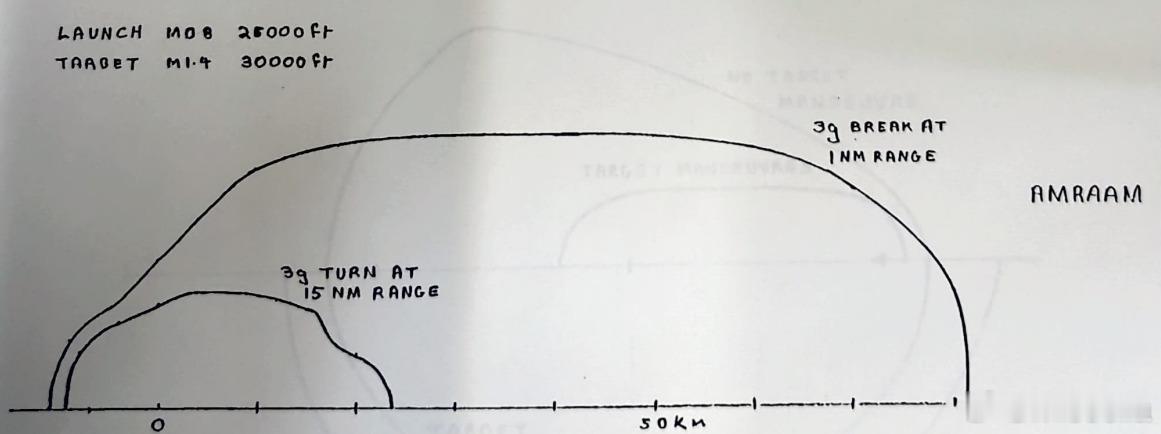 英国海鹞解密文件上的AIM-120射程包线图片来自2017年解密的英国海鹞改进文档,该文档编写于1984年,现存于英国邱园国家档案馆,需要预约查阅。1984年休斯公司的先进中程原型弹也就是AIM-120已经确定方案及战术指标,早些时候已进行过原型弹试射,导弹弹道性能是明确的。海鹞FRS MK2于90年代改装AIM-120A导弹。第一幅图没有标载机与目标的速度、高度,从射程判断应该是5000-6000米,m0.8。横轴上小三角标志是发射起始点,小三角左边是前半球目标,右边是后半球目标。最外侧的包线表示目标零过载射程,58千米。中间是导弹离目标1海里时目标作3g转弯规避,射程48千米。最内侧包线假设目标距载机15海里开始3g转弯规避,导弹的最大射程。第二幅图载机高度25000英尺,速度M0.8。目标高度30000英尺,速度M1.4。海鹞实用发射包线即是如此。可以看到目标1海里3g规避,导弹有效射程已经达到81公里。无机动目标最大射程没标,根据第一图的射程推测,约95公里。15海里转弯射程24公里。这里导弹射程受限于海鹞的最大速度,无法在接近音速或超音速下发射,而且无法正高度差发射,这些都实际制约导弹射程。一般来说比例导引律要求对平飞无机动目标迎面攻击需要1.2比1的弹目速度比,如果目标3g机动,则需要导弹有10g左右的机动才能成功遭遇目标,因此第二幅图导弹远点速度至少能在30000 英尺拉出9g过载,此时导弹速度可能有m2以上。已知AIM-7F在40000英尺高度超音速发射拦截超音速目标空气动力学射程96公里,AIM-120A换算到同等条件,可以达到150公里。R-27ER根据网传包线,10公里高度载机、目标表速1100公里/小时,射程约六十公里。AIM-120A在高度速度均低不少的情况下射程比ER更远。目前有些模拟游戏里ER高空比120A飞的更快更远,显然是不准确的。