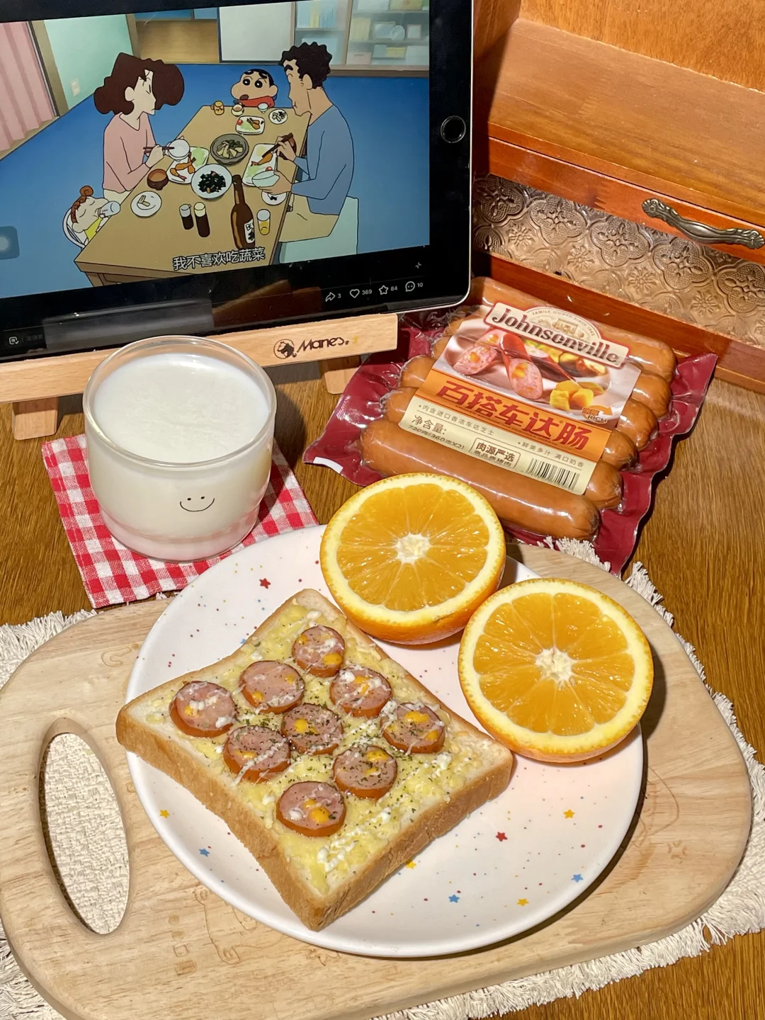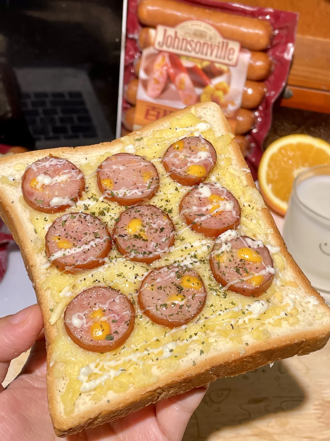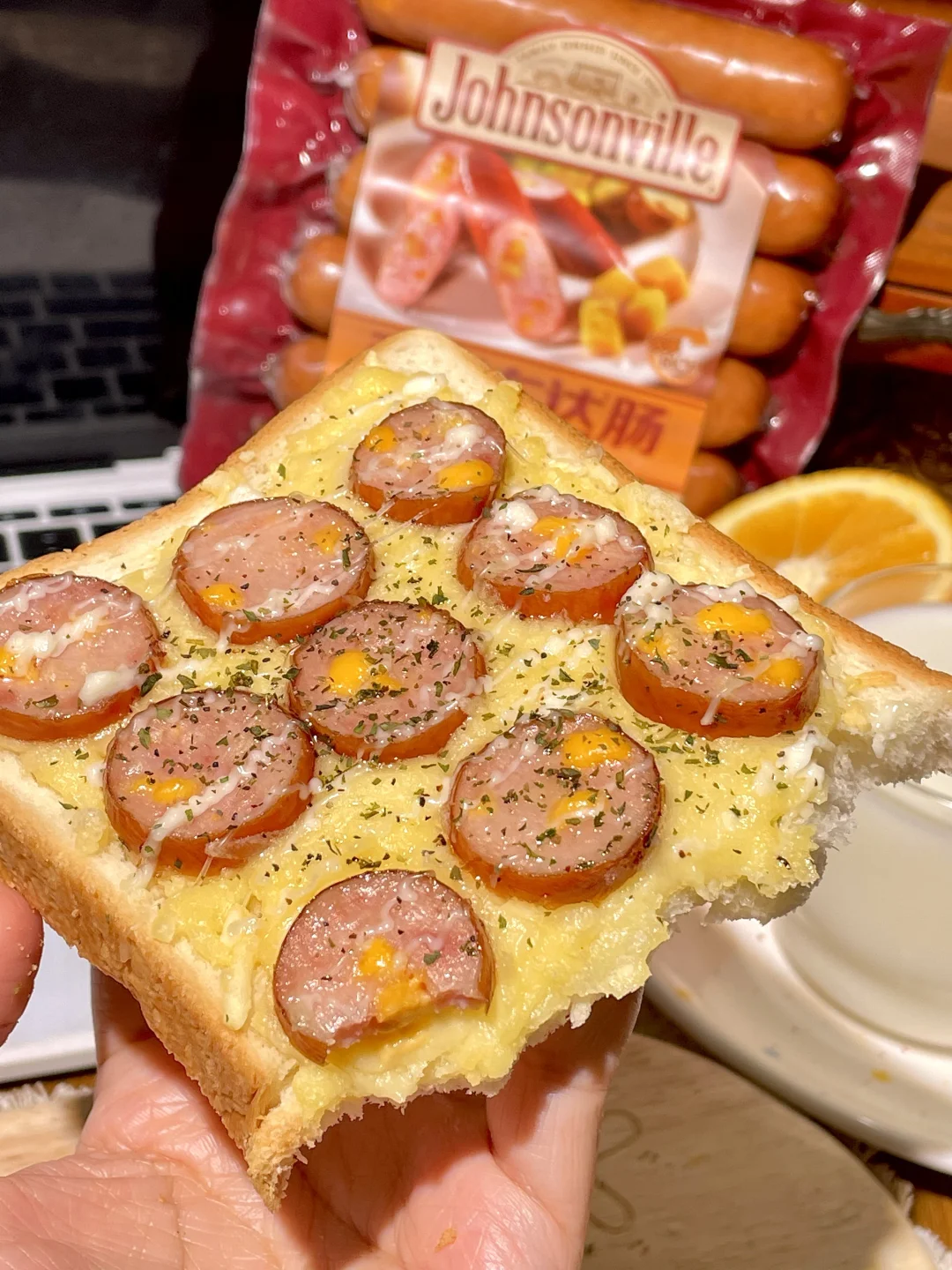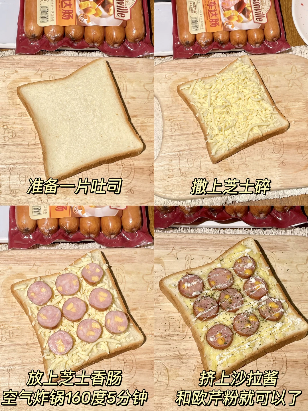 ✨get到一个神仙吃法:吐司抹上番茄酱 再撒上马苏里拉和玉米粒 最后铺上百搭车达肠,