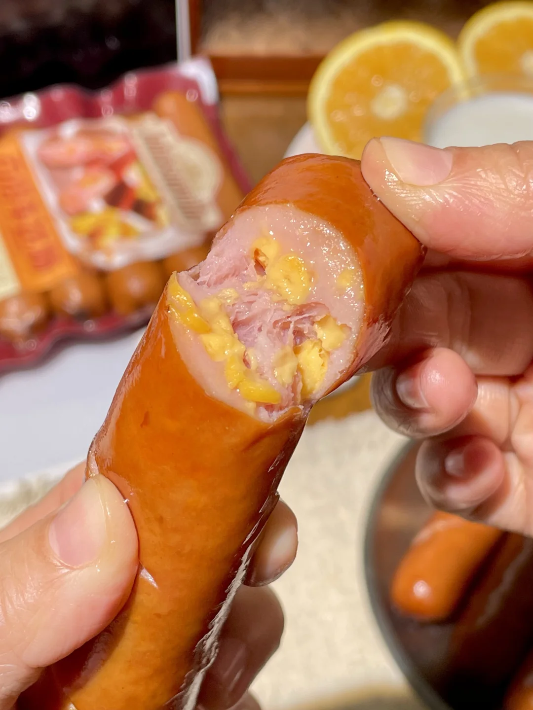外面脆脆的肠衣+纯猪肉+芝士夹心