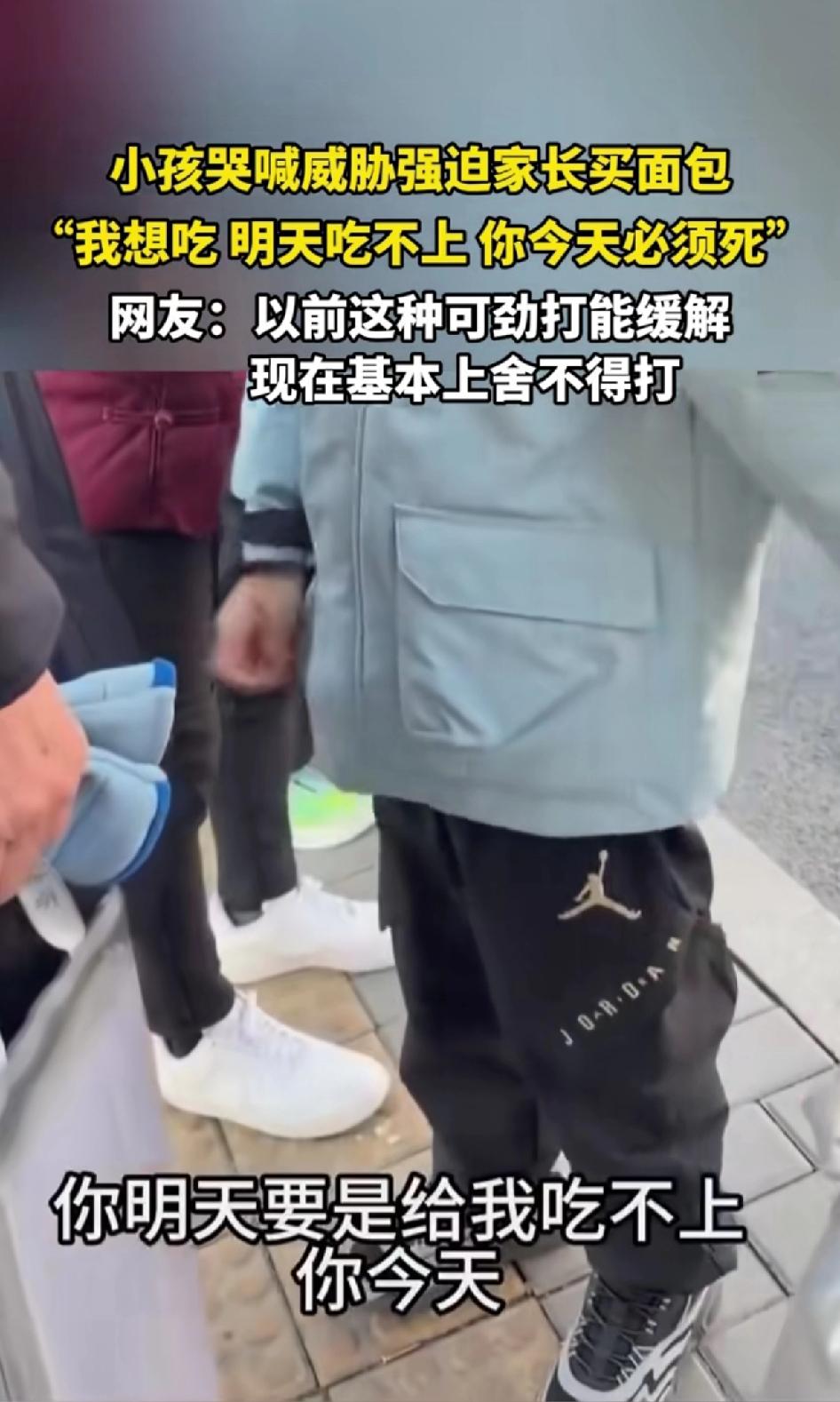 你快给我买!“我明天吃不上,你今天必须死” 小孩情绪激动威胁父母,必须的给自己买面包,如果明天吃不上,你必须死。 现在家长真是宠孩子宠的没边,以至于这么大个小子,对着父母口出狂言,面对父母不满足自己的要求,开口就是让父母必须死。 这小子要是生在70-80年代,一定会被父母混合双打。小小年纪口出狂言,学会威胁父母了。 记得哥哥小时候考试没考好,都被爸爸一顿胖揍,揍完扔在地上一块砖头,自己主动去跪着,除了上厕所,不到点不能起来。 还有一次,二哥犯了错,爸爸正在教训二哥,喊了一声跪下,结果二哥还没跪下,在旁边的三哥吓得先跪下。[捂脸][捂脸][捂脸] 以前老一辈人的思是,想棍棒底下出孝子,不打不成才,打完骂完还要PUA,什么不打不成才,父母打骂都是为了孩子好。[捂脸][捂脸][捂脸][捂脸][捂脸]所以那个时候的孩子被忽悠的一愣一愣的,挨完打还会感激父母。[呲牙] 哪像现在的父母,孩子犯了错,父母也根本不舍得动一根手指头,自己不舍得吃、不舍得喝也要省了满足孩子,犯了错最多吵一顿。