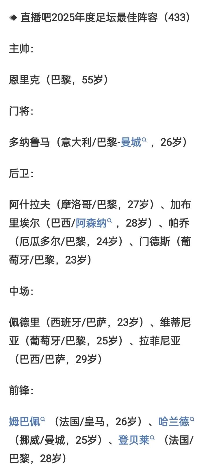 2025年度最佳阵容:登+哈+姆领衔锋线,拉菲、维蒂尼亚、佩德里最佳中场,阿什拉夫、加布、帕乔、门德斯最佳后防线 2025年即将走过,2026年即将到来! 2025年直播吧评选出度最佳阵容,是否与你心中的答案一致?谁的成功实至名归,谁的落选又让你意难平