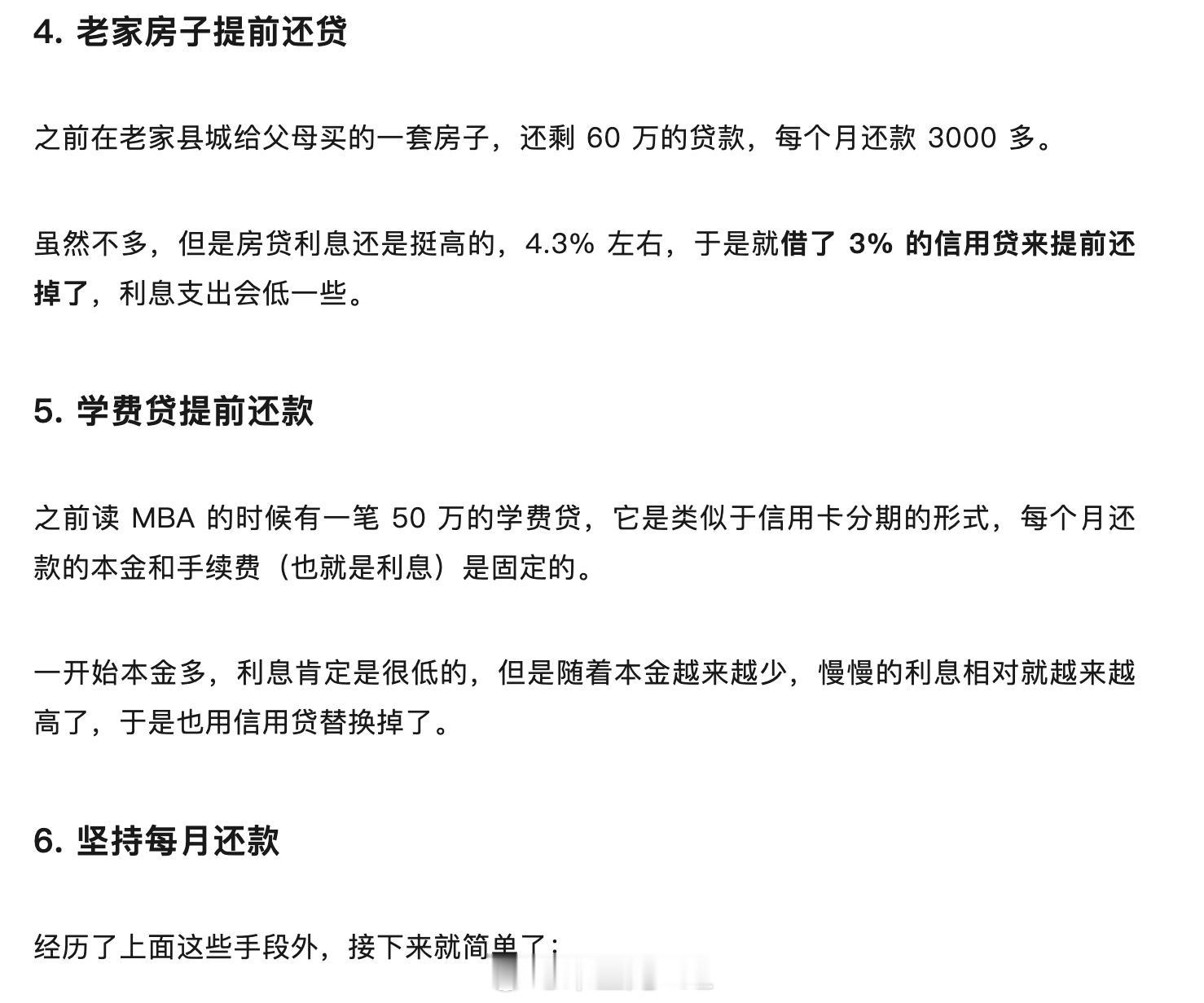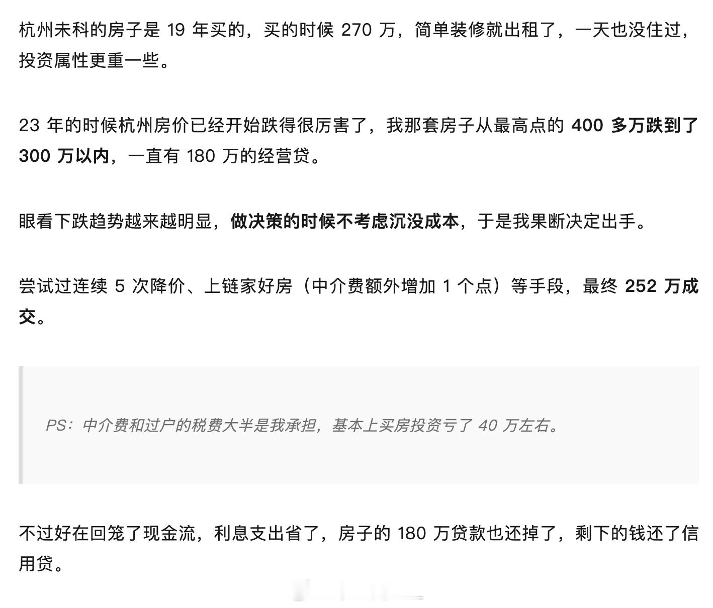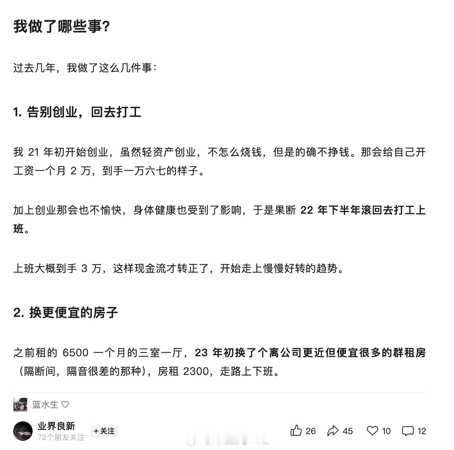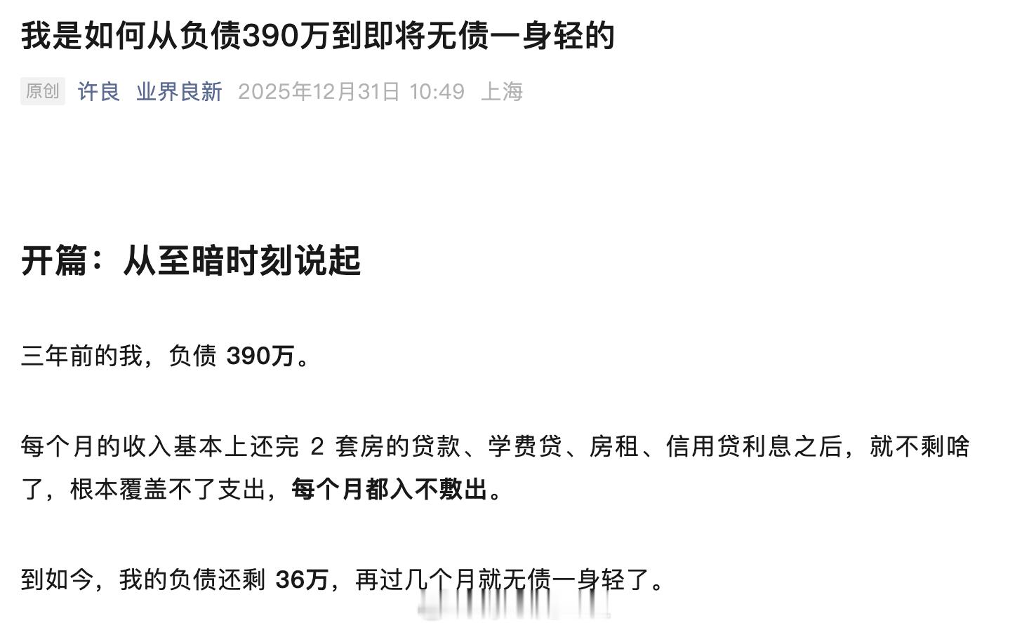 早上看到朋友发了一文章(我下午的时候私信祝贺他,感觉他走过了人生一段路,幸福上岸了),从负债390万到解脱。我给大家归纳一下至暗时刻。:负债390万,每个月的收入刚好还完两套房贷、学费贷、房租和信用贷利息,现金流长期为负,根本看不到出口。三年后:负债只剩36万,再过几个月,就能真正无债一身轻。几件关键的事。1)果断结束不赚钱的创业,回去打工。稳定收入到手3万,现金流先活过来,比情怀重要。备注:这个绝大多数朋友做不到,这36万净收入,你想想现在这门槛😂2)从6500的三室一厅,换到2300的群租房,步行上班,每一块钱都用在刀刃上。3)卖掉下跌中的房产,不纠结沉没成本。杭州的房子亏了40万,但换回了现金流,直接还掉180万贷款和信用贷。4)用低息贷款替换高息负债,提前还房贷、学费贷。死磕执行力,工资、公积金、副业收入,除了必要开支,全部拿去还债。中间也踩过投资的坑,交过学费,但没放弃。回头看:负债不可怕,真正可怕的是不面对。在环境下行的年代,苟住、活下去,就是赢。莫名有点燃,但是好像普通人遇到这个局,卖房,找工作,省钱都不容易下决心!