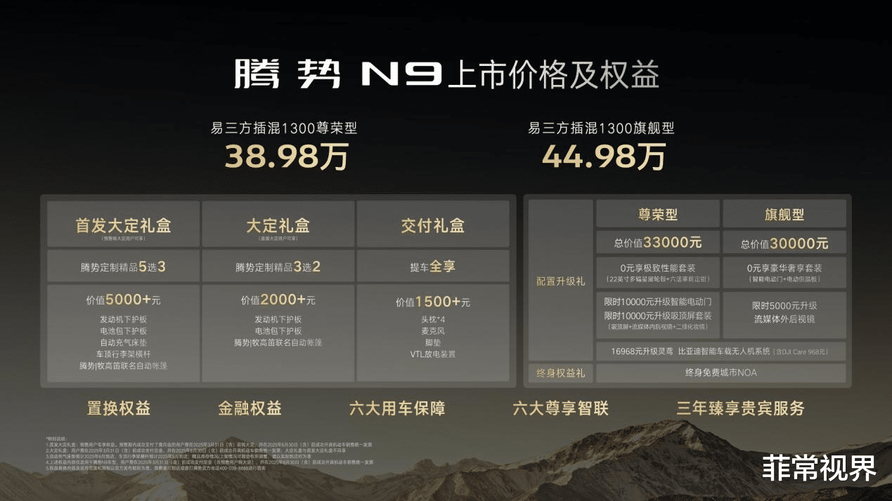 为感谢预售用户的信赖,腾势N9特别推出限定礼遇:预售转大定用户可享价值5000+元首发大定礼盒;直接大定用户可享价值2000+元大定礼盒。所有提车用户皆可享价值1500+元交付礼盒,诚意拉满!此外,腾势N9还重磅推出16968元升级灵鸢·比亚迪智能车载无人机系统、终身免费城市NOA、至高10000元置换补贴、12期0息等六大上市权益。