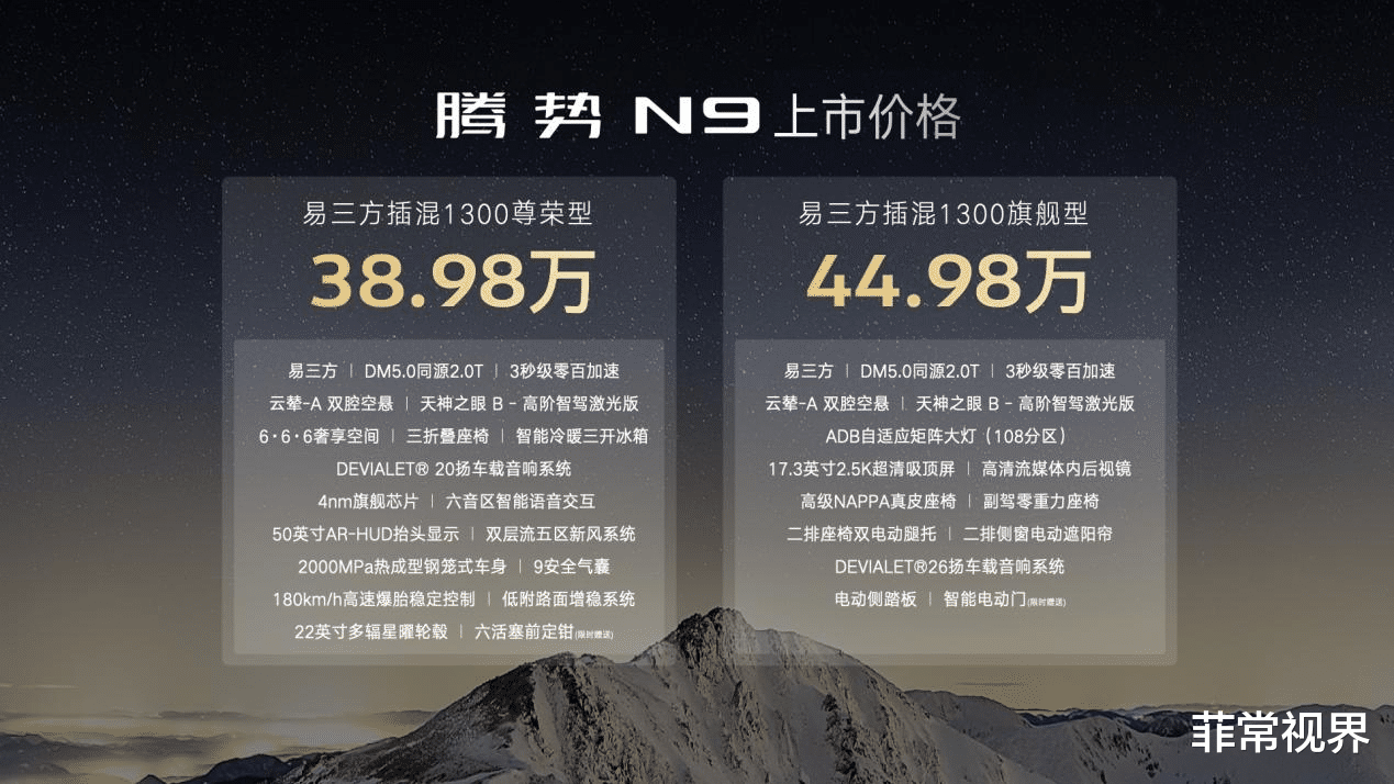 日前(3月21日),科技安全全能旗舰SUV腾势N9震撼上市不再低调,以科技致敬奋斗者时代。推出易三方插混1300尊荣型、易三方插混1300旗舰型,官方指导价38.98万元—44.98万元。科技重构旗舰SUV,腾势N9全系标配易三方、2.0T超级混动、云辇-A(双腔空气悬架)、天神之眼 B,重塑50万级大型旗舰SUV价值标杆,开启科技豪华SUV新纪元。
