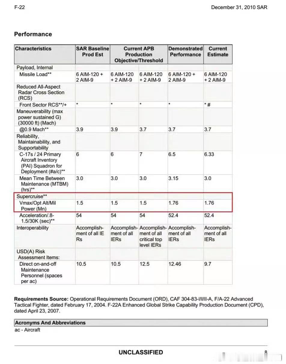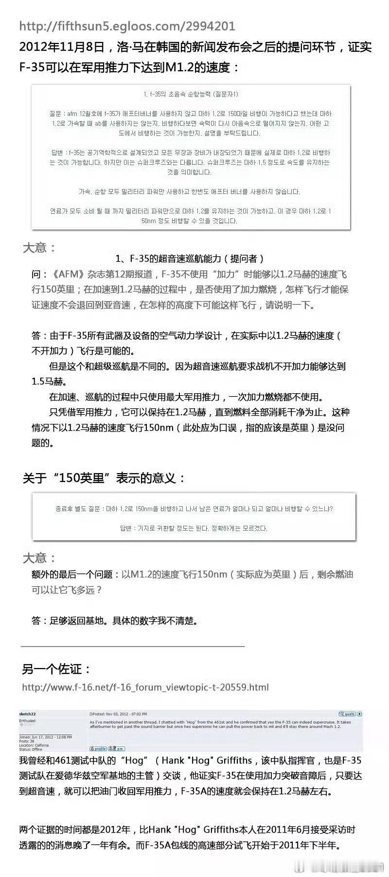 武器装备日耳曼赢学每天认识一件兵器 超声速巡航赢学➡️国内超巡标准在9000~13000米高度以1.4马赫以上的速度不开加力维持巡航(图1)➡️根据洛马官网挂的F22A超巡半径130海里,按3倍鸡血计算其超巡航程390海里/约722KM,图2证明F22A经济超巡速度1.5马赫巡航722KM约24分、最大超巡速度1.76马赫计算722KM只能巡航4分15秒。可见F22A宣传的近半小时超巡的代价是把它的作战半径缩小到米格29A机场保卫者水平。➡️图3显示F22A除了410海里/759KM半径外,还有一个超巡100海里/185KM➕亚巡合计约1100KM的半径,1.5马赫约4分46秒、1.76马赫约4分03秒,可见F22A如果不想短腿就只能限制开超巡4~5分钟。➡️图5是我国著名的歼8战斗机在高空不同高度的巡航速度和等速平飞时间,可见在2万米高空八爷能以1.8马赫的速度平飞5分钟、完全略胜F22A的以1.76马赫巡航4分15秒的水平。可见八爷在无外挂状态下超巡能追上F22A,但是F22A能在超巡状态下维持6.5g稳盘过载、八爷只能平飞不能拉高g过载且必须开加力破音障。➡️再看图4的F35在洛马官方访谈里宣传其不具备真正的超巡(不开加力达到1.5马赫),但可以1.2马赫速度不开加力飞行150英里/约241KM(强调限制在加速、巡航动作直到燃料全部耗尽暗示F35以1.2马赫跨音速飞行也不能拉过载、只能平飞,如果机动了大概率减速),耗时约6分17秒。⭐️结论:歼8超巡速度和时长在特定条件下能媲美F22,准超巡压倒F35。