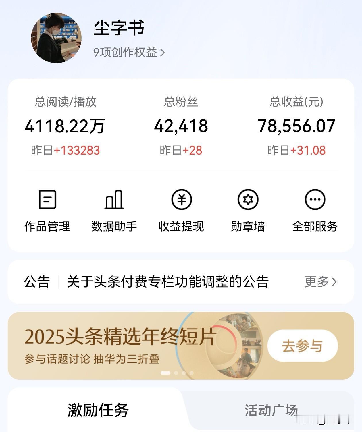 昨天的收益31.08,个人感觉还是蛮失望的,因为昨天爆了一篇10多万阅读的,要是放在以前至少得有50。为什么这么低,可能和下面几个原因有关。 根据我的创作经验来看,一篇内容的收益主要来自投放的广告,像我写的这篇虽然阅读量大,但内容就是很普通的家长里短,可能不太好匹配高收入的广告,流量带来的收益也就没多少。 另一方面,我这篇内容的互动率也不乐观,10多万阅读才200多个赞,我觉得至少要在1000左右的互动数据,可能收益才会更多一点。 但怎么提高互动,这确实是个问题,我也没什么好办法。