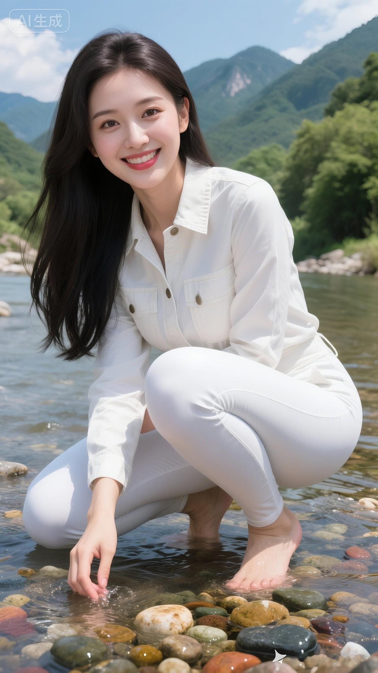 夏日清凉,山间溪流,白衣少女,笑靥如花。