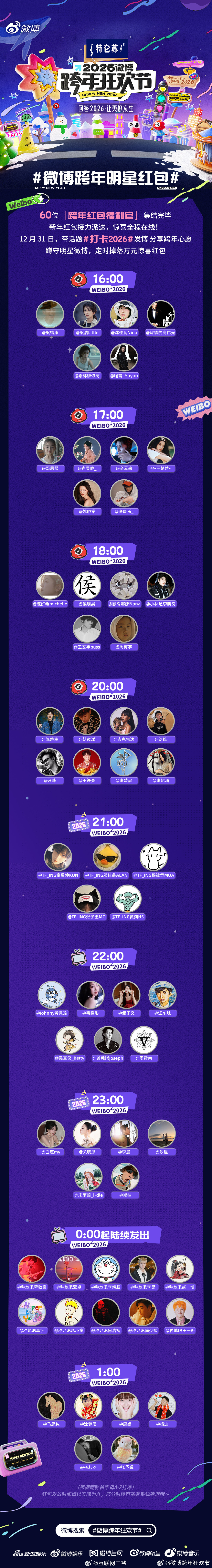 微博跨年明星红包跨年晚会节目单给大家按照时间节点分类整理好今天跨年夜发红包的明星了。18:00(三爷发出)起陆续发出红包分组打卡2026