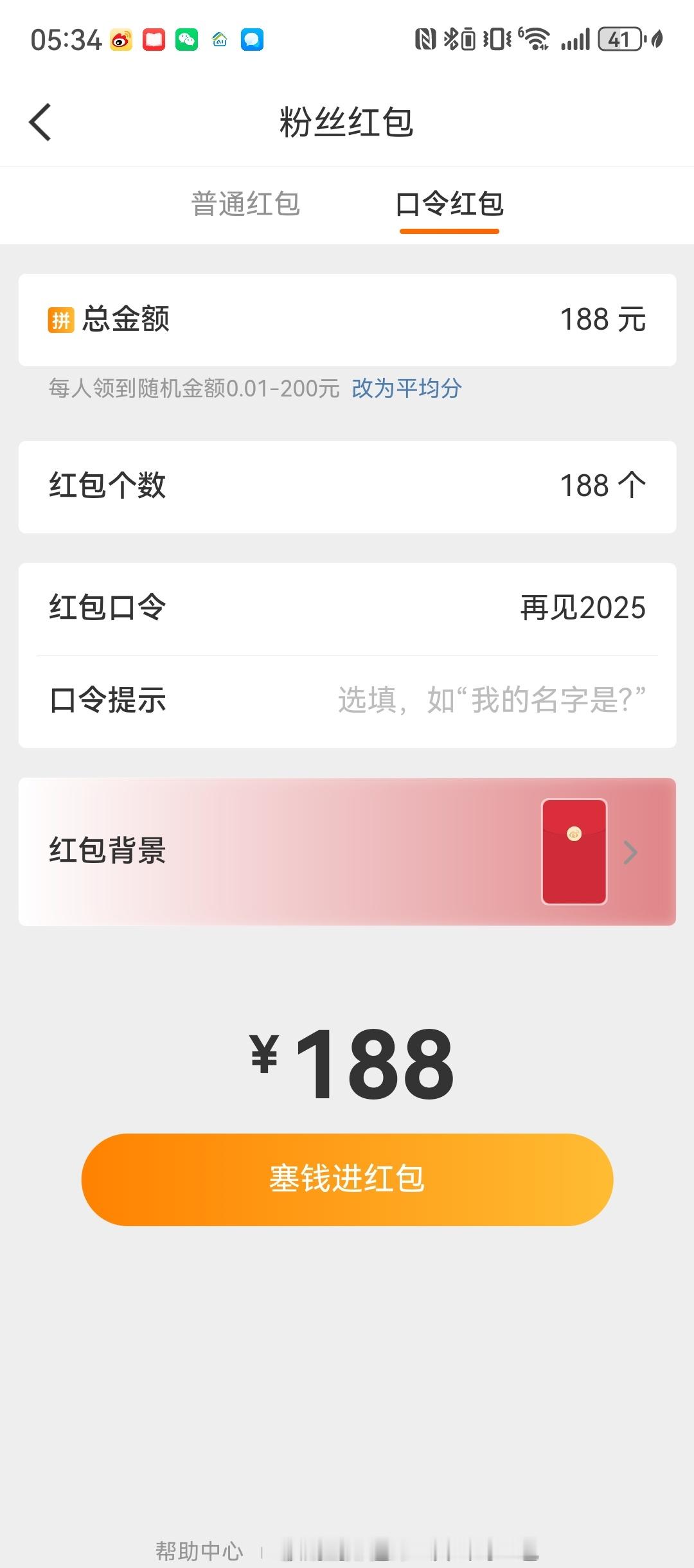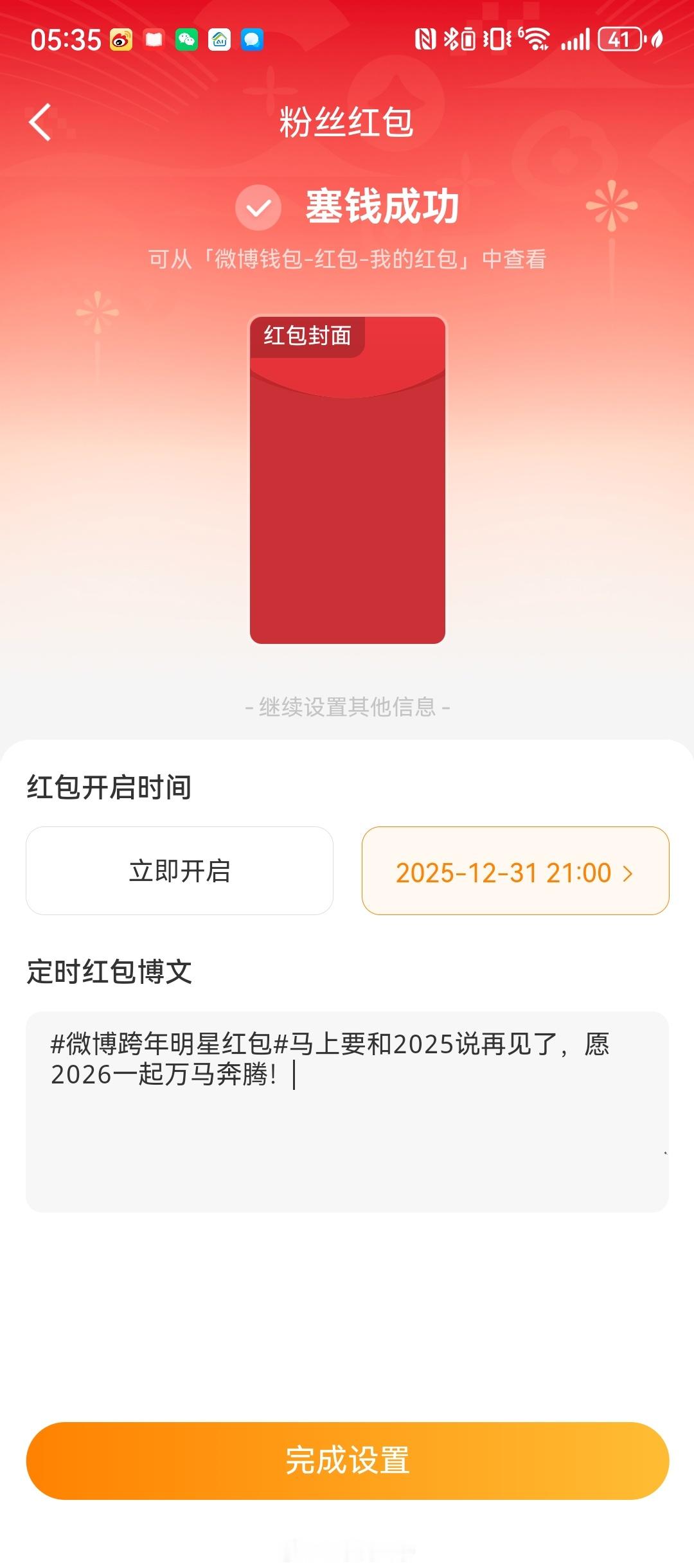 微博跨年明星红包 21点的跨年红包已经定时好了,朋友们关注好,188个红包,口令“再见2025”,准时来抢!