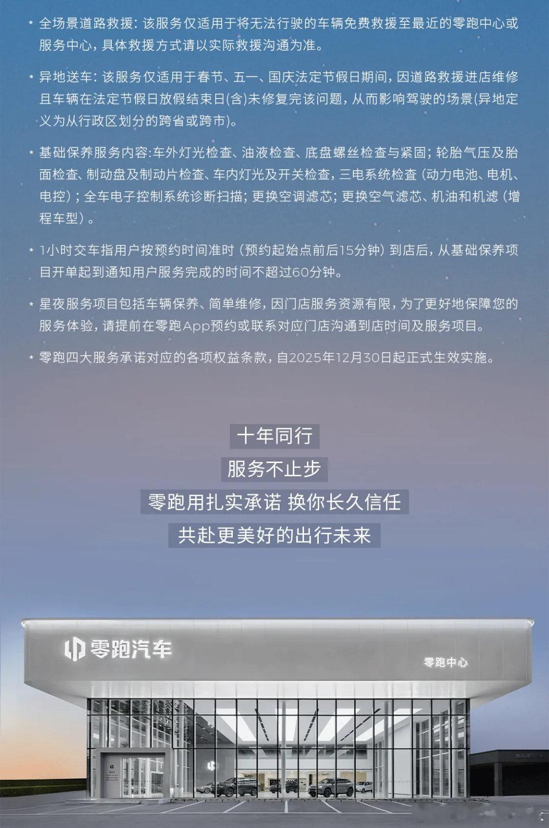 零居出行安全感拉满零跑四大服务承诺上线!零居出行安全感拉满谁懂啊!新能源车售后最怕“说不清、等不起、没人管”?现在零跑直接把定心丸焊死在服务里——12月30日四大服务承诺正式落地,从假期救援到日常维保,全场景守护每一段旅程~ 假日出行无忧:春节/五一/国庆免费全场景道路救援,假期修不好?修好直接免费异地送车(跨省辖市适用),自驾再也不怕半路“掉链子” ! 1小时极速保养:零跑App预约准时到店,基础保养60分钟搞定!三电检测、滤芯更换、底盘紧固全包含,全国门店通用,不用请假排长队~ 维保透明可见:App实时查电子工单,服务项目、维修进度、每笔花费一目了然,拒绝隐形消费,知情权直接拉满 !星夜服务延长:超百家门店营业至20:00,下班顺路就能做维保,不用占用周末时间,打工人狂喜~(App可查门店是否有“星夜服务”标签)从假期应急到日常养护,零跑的服务从来不是空口号,而是看得见、摸得着的安心!零跑10周年零居大会我的零跑生活
