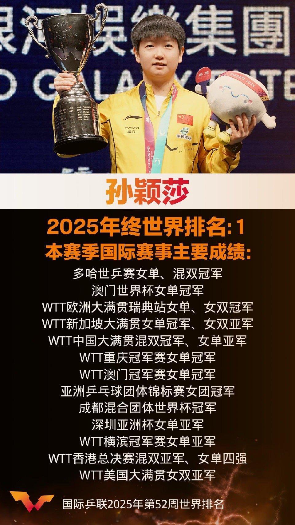 孙颖莎单打六冠外战无失球员:孙颖莎(CHN)世界排名:1️⃣年终积分:1️⃣1️⃣6️⃣0️⃣0️⃣🏆🏆🏆🏆🏆🏆单打六冠,外战无失;稳如磐石,锐不可当。