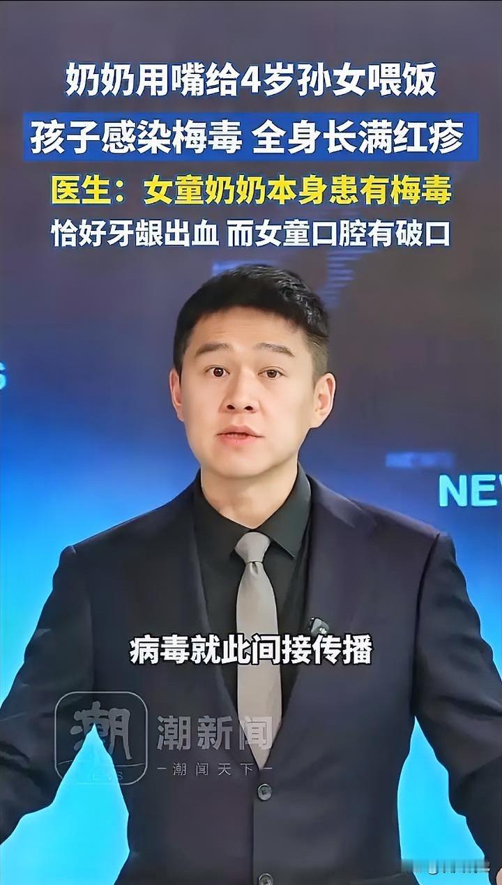 刷到个吓人的事,金华有位奶奶用嘴给4岁孙女喂饭,结果孩子全身长满红疹,一查竟感染了梅毒!医生说奶奶本身患有梅毒,喂饭时牙龈出血,孙女口腔又有破口,病毒就这么传过去了。 很多老人带娃总觉得“以前都这么带”,用嘴试饭温、嚼碎食物喂孩子,觉得是疼孩子,哪知道这可能把病菌直接传给孩子。就像这个梅毒,谁能想到用嘴喂饭也能传染? 说白了就是卫生意识不到位!孩子免疫力弱,老人如果有口腔问题或传染病,这种亲密接触太危险。咱们疼孩子得用对方法,别让好心变成伤害。你们家老人带娃有这种习惯吗?