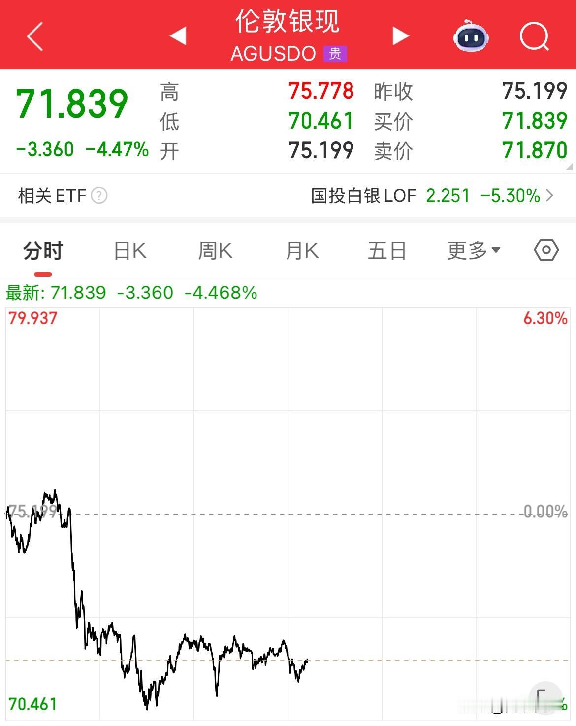 涨的有多欢,跌的就有多狠,70美元能不能支撑的住,白银跌幅超4%,盘中最低70.46美元/盎司,纽约银期货大跌超8%,沪银期货大跌超4%,最高差2个点就20000点了,到现在直接跌幅3000点了 金银比超调,还是涨多了获利盘出套,还是上调保证金去杠杆的原因,年内已经涨幅超170%,这样的疯涨,资金蜂拥而至,多头拥挤,就看70美元能不能扛的住了。